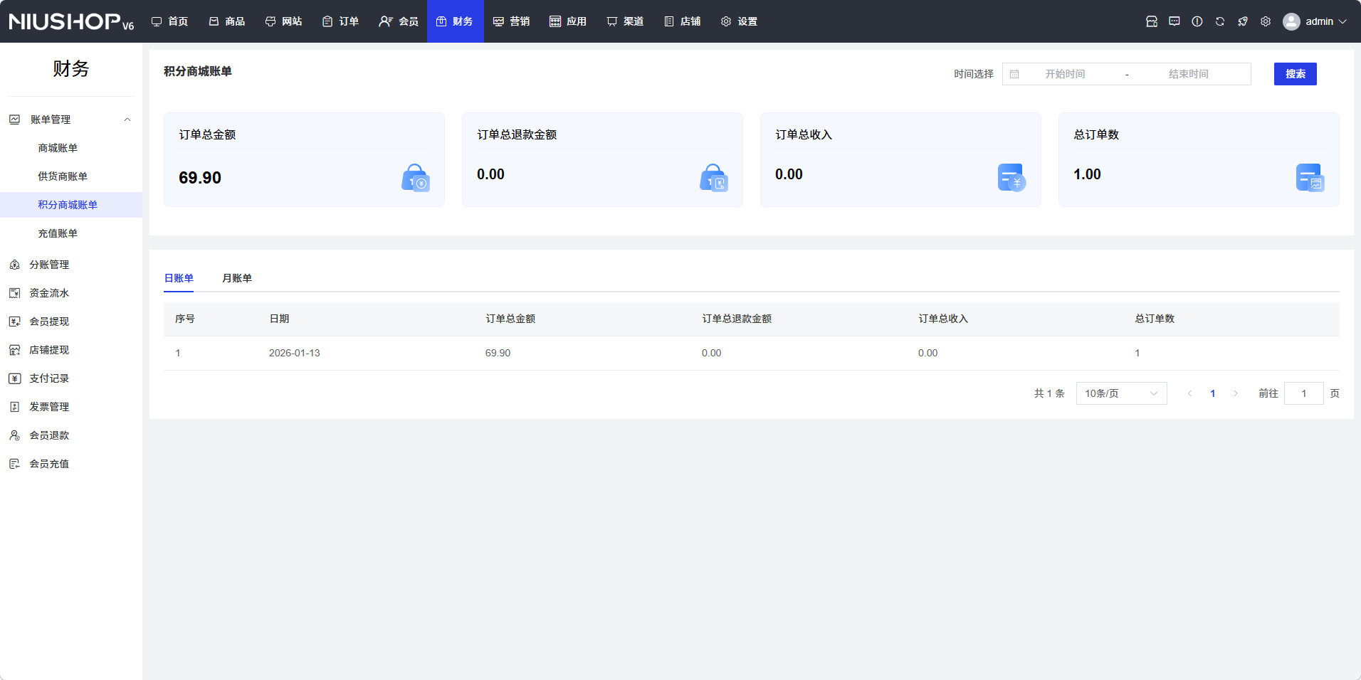 在积分商城账单页面顶部,查看订单总金额、订单总退款金额、订单总收入、总订单数等核心财务指标,快速了解积分商城的运营状况。