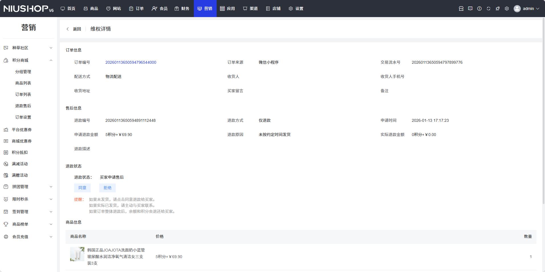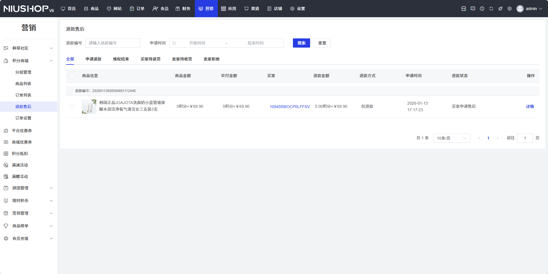 退款售后功能用于管理积分商城的退款申请,包括查看退款信息、处理退款申请、查看退款详情等。通过退款售后管理,可以处理用户的退款请求,维护良好的用户体验。