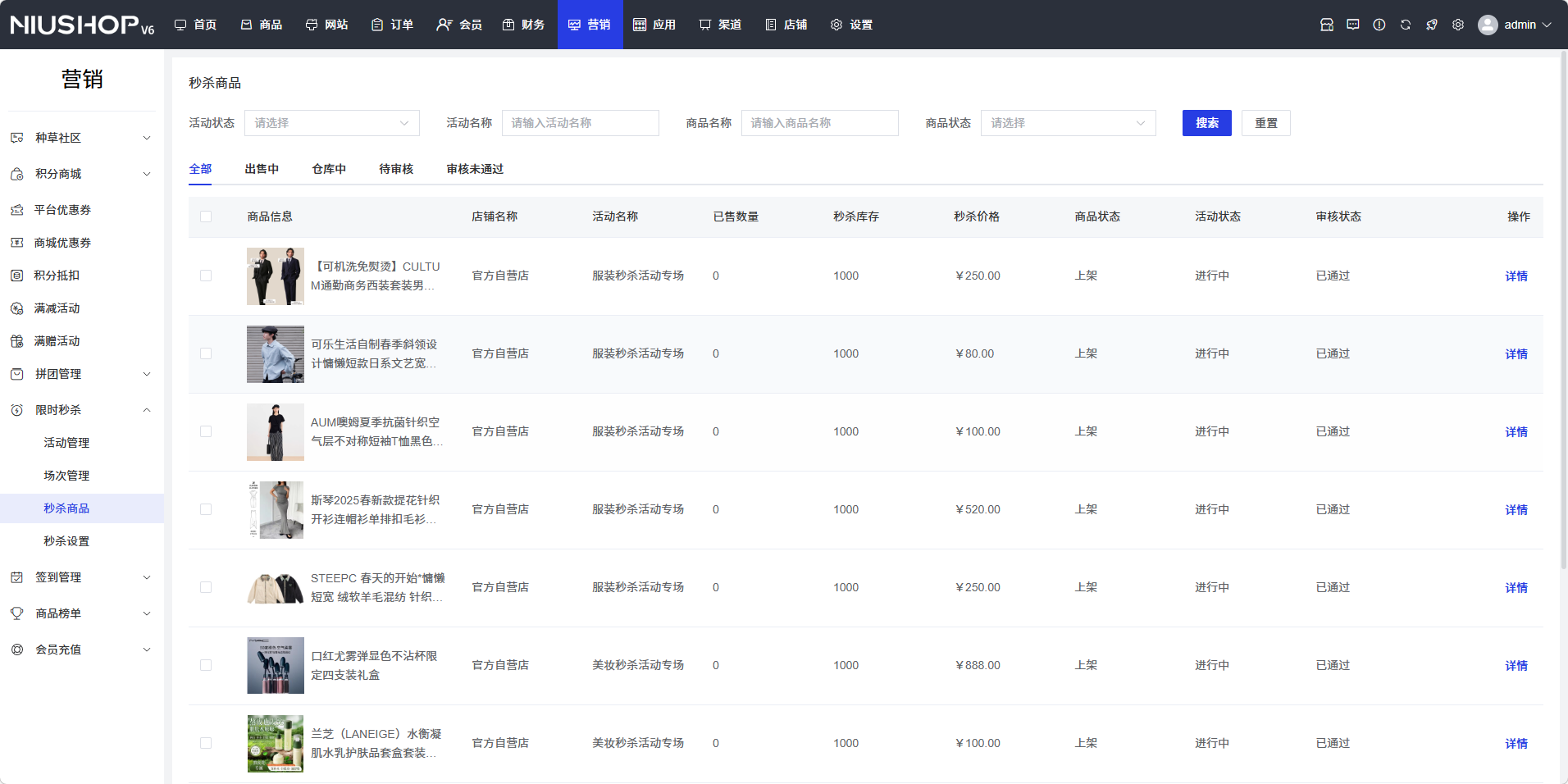 秒杀商品功能用于管理限时秒杀活动的商品,包括查看商品信息、审核商品、管理商品状态等。通过秒杀商品管理,可以确保活动商品的质量和合规性,提升活动的效果。