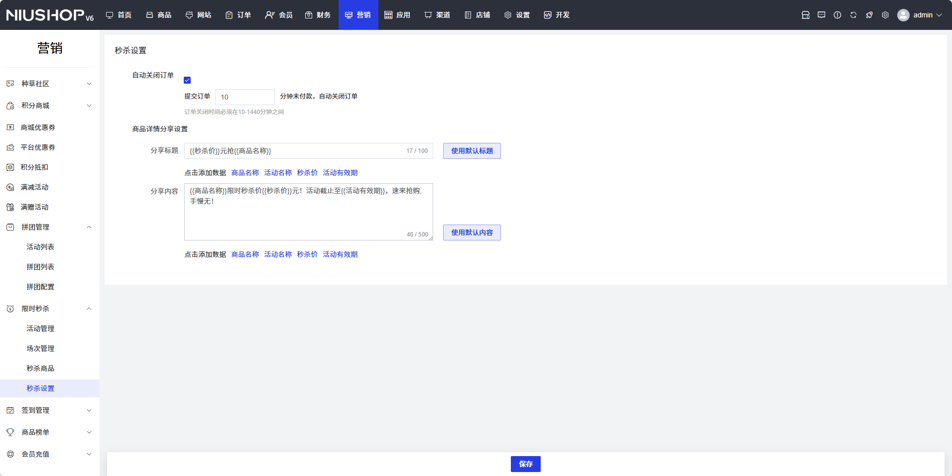 配置完成后,点击页面底部的「保存」按钮,保存秒杀设置。