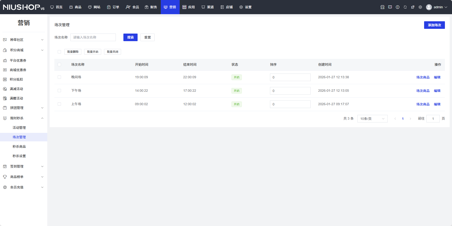场次管理功能用于管理限时秒杀活动的场次,包括添加、编辑、查看场次,设置场次名称、秒杀时段、排序、状态等。通过场次管理,可以灵活配置秒杀活动的时间安排,提高活动的组织效率。