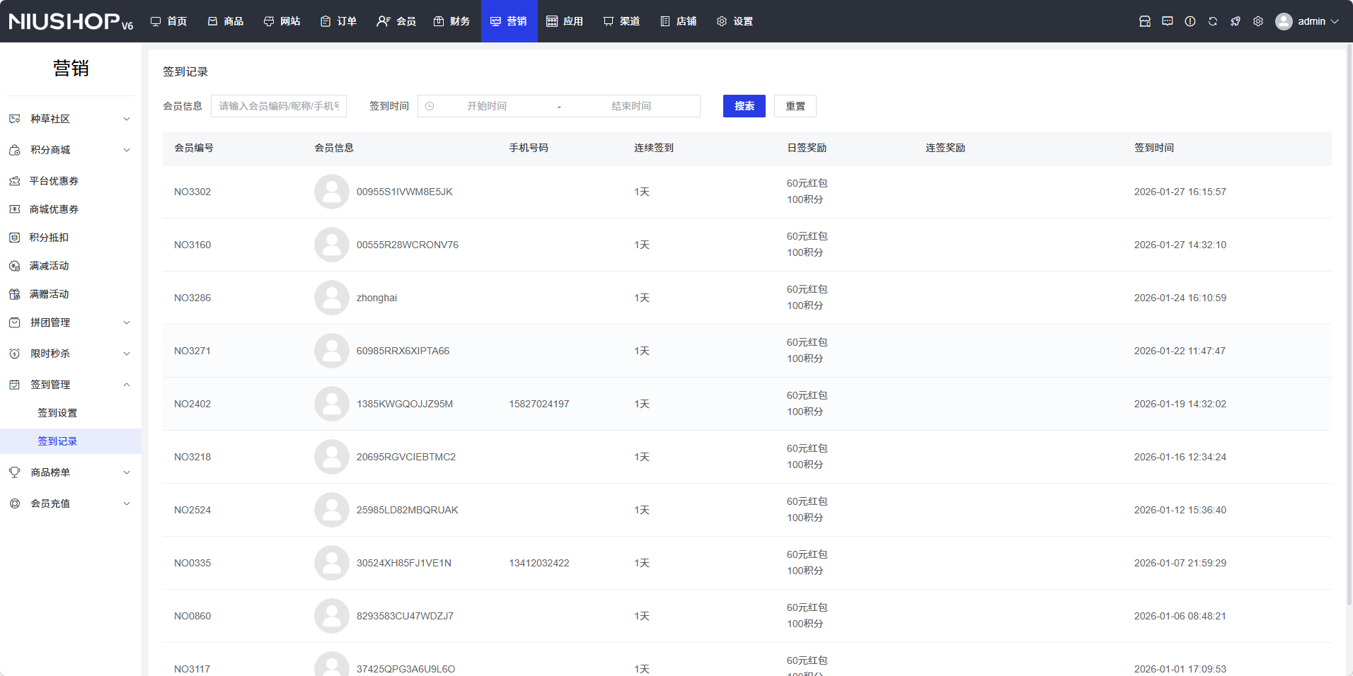 签到记录功能用于查看会员的签到情况,包括会员编号、会员信息、手机号、连续签到天数、日签奖励、连续奖励、签到时间等。通过签到记录管理,可以了解会员的签到行为,分析用户活跃度。