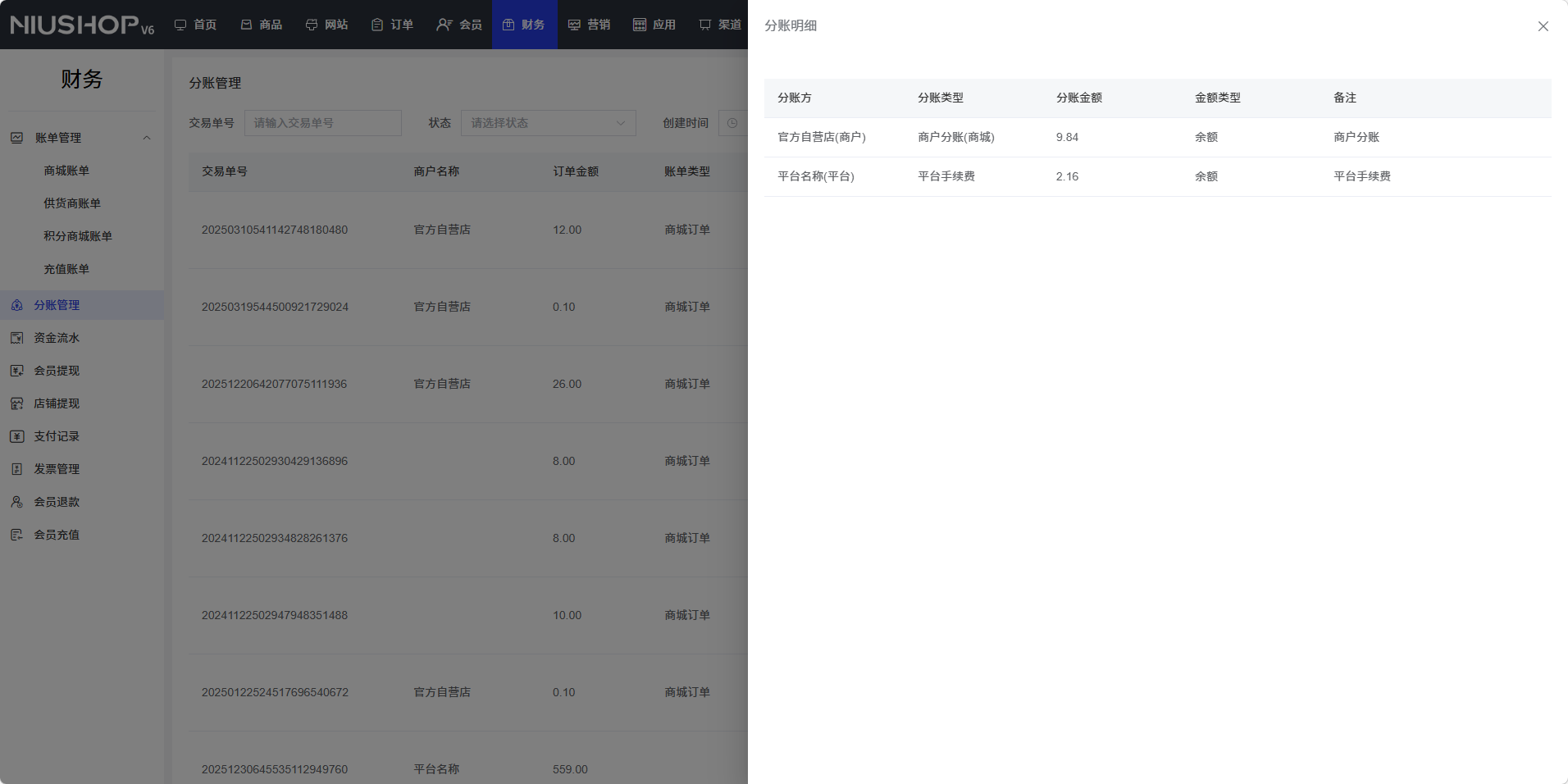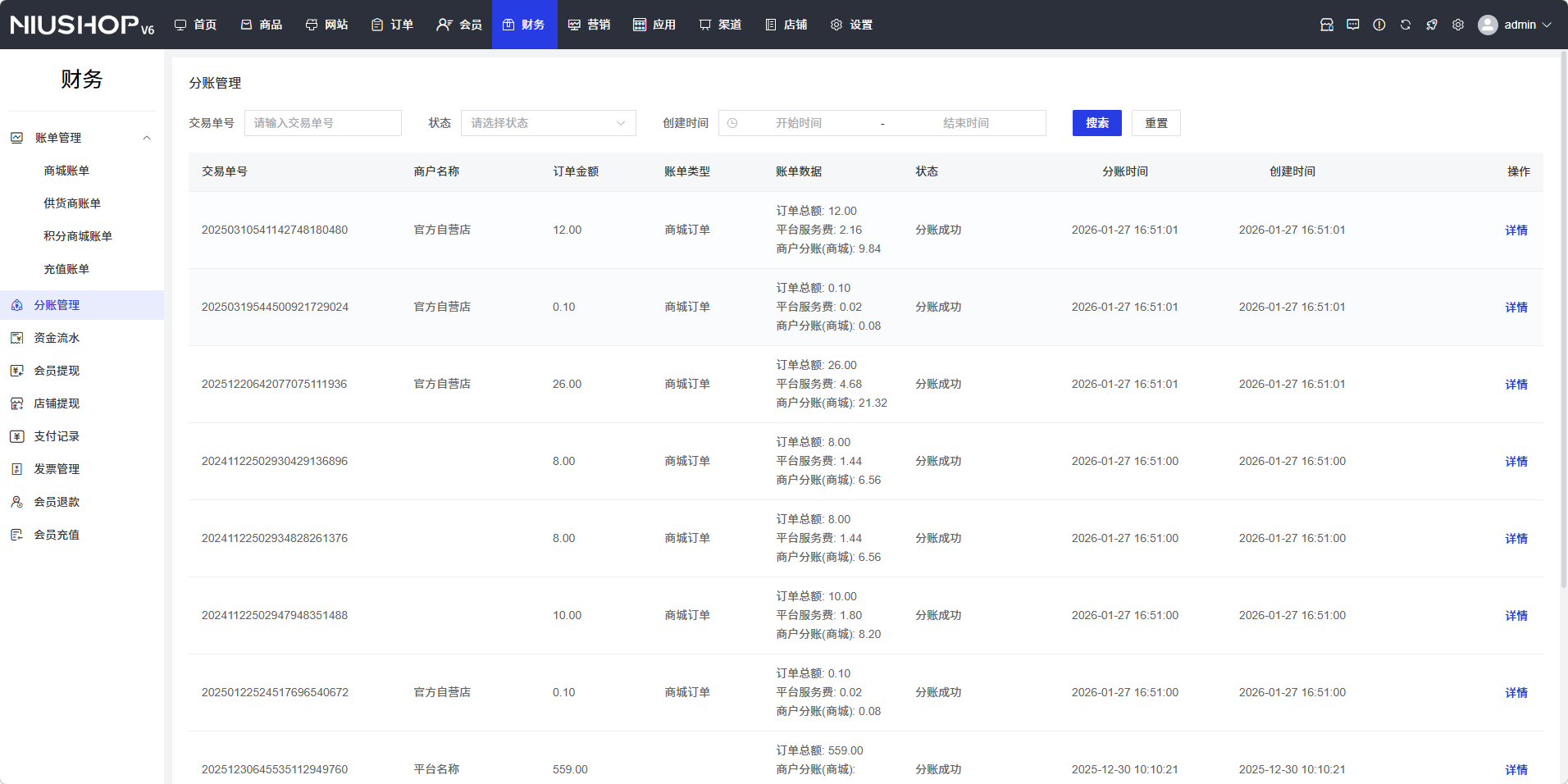 分账管理功能用于查看和管理商城的分账记录,包括交易编号、商户名称、订单金额、账单类型、分账状态等信息,支持查看分账详情和筛选功能。