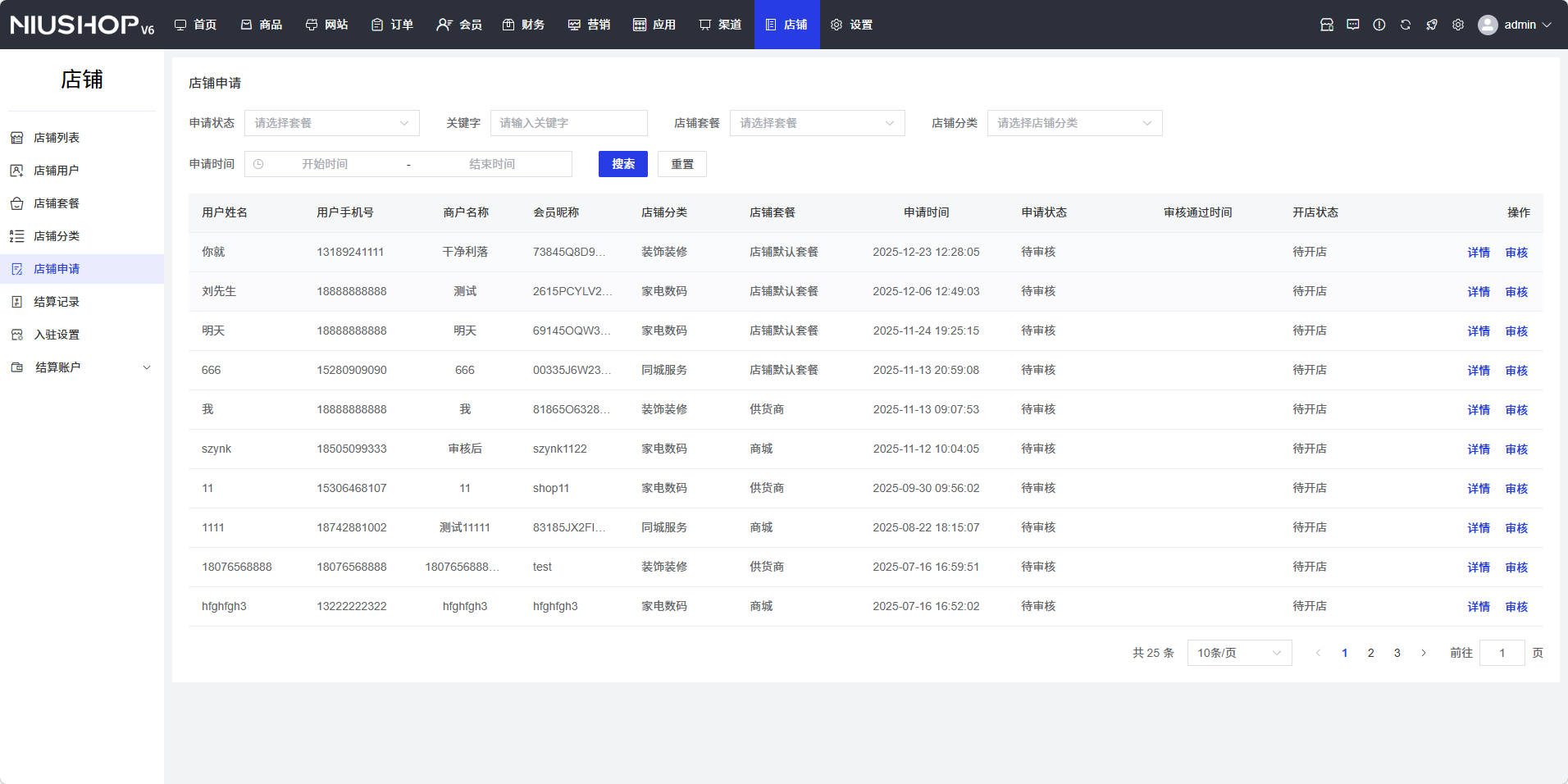 找到需要查看详情的店铺申请,点击操作列中的「详情」按钮,查看店铺申请的详细信息。