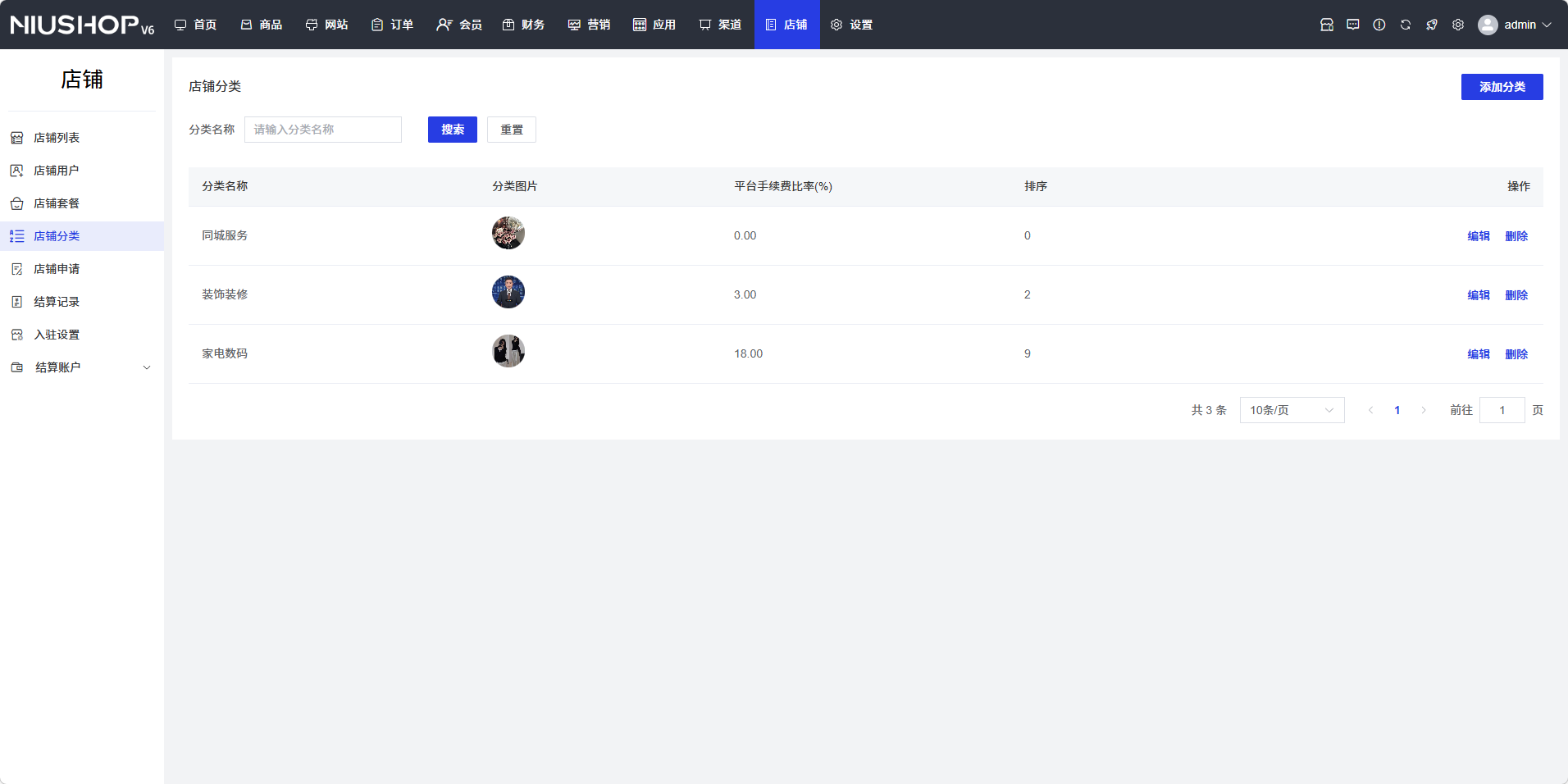 店铺分类功能用于管理平台的店铺分类,包括查看店铺分类列表、搜索店铺分类、添加店铺分类、编辑店铺分类、删除店铺分类等。通过店铺分类管理,可以有效管理平台的店铺分类,为店铺提供合理的分类结构。