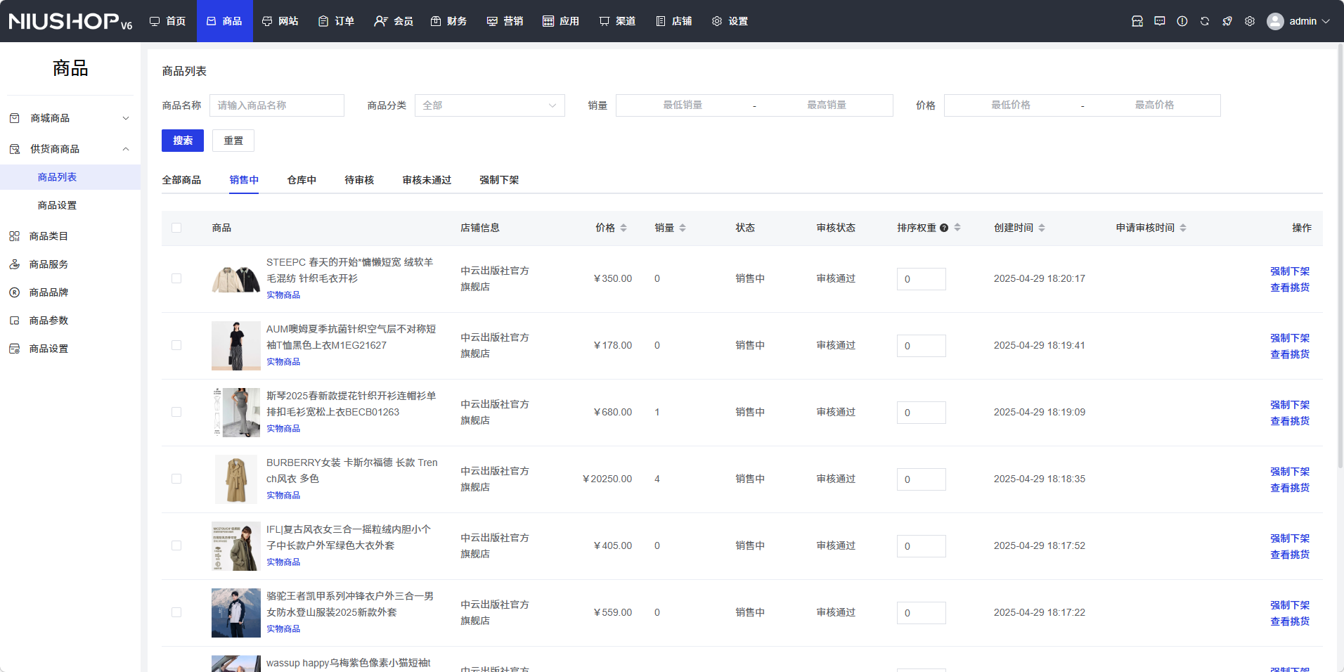 供应商商品列表页面用于管理供应商提交的商品,包括查看商品信息、筛选商品、对商品进行强制下架等操作。