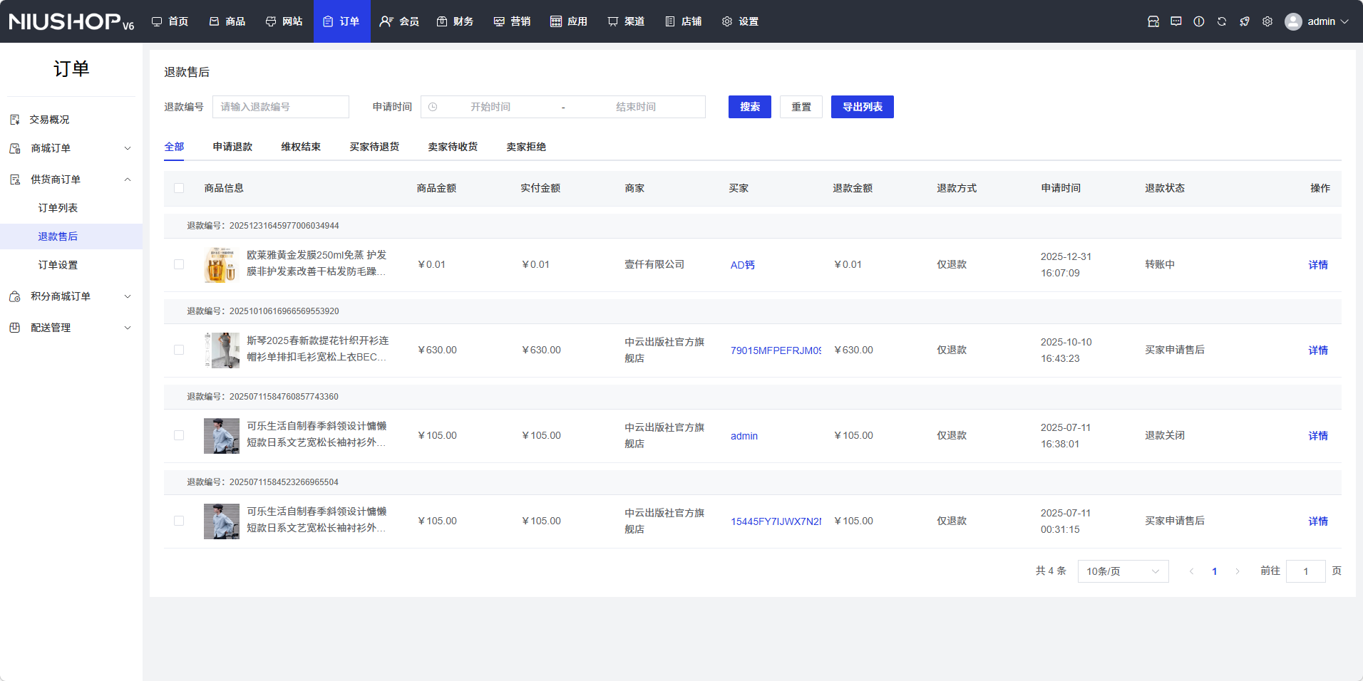 供货商退款售后功能用于管理和处理供货商订单的退款申请,包括查看退款详情、处理退款申请、导出退款数据等。通过供货商退款售后管理,商家可以及时处理用户的退款请求,提高用户满意度。