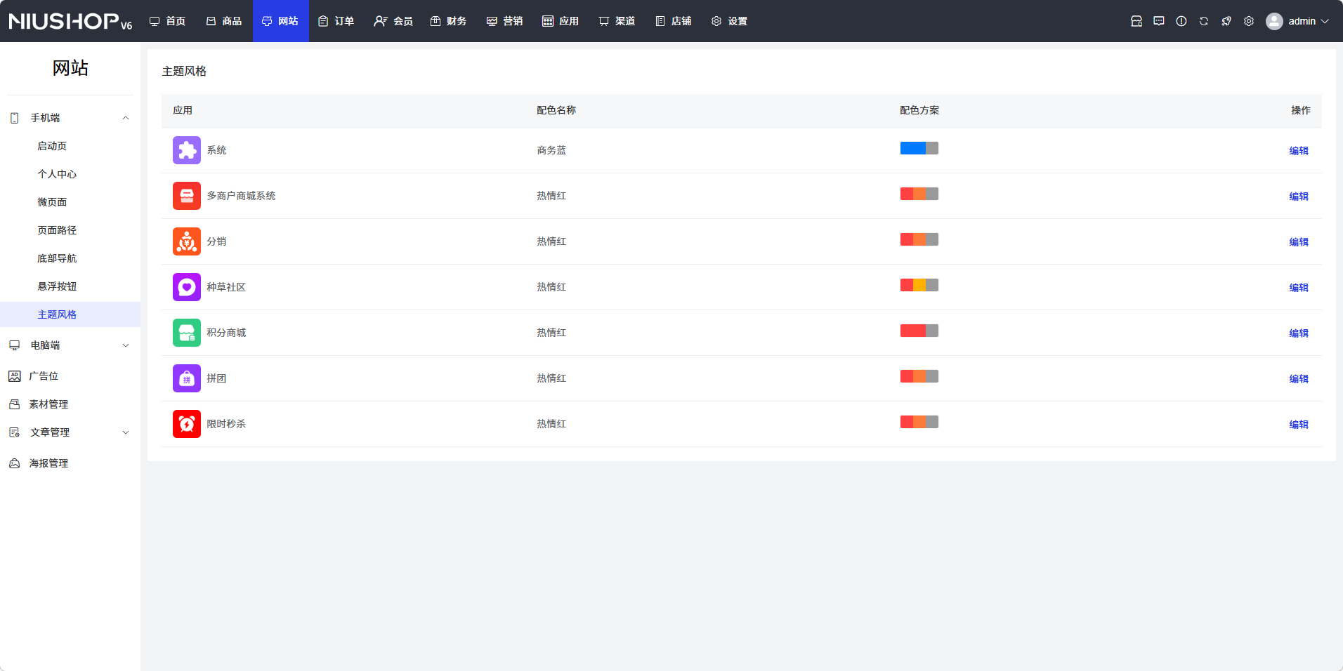 主题风格管理功能用于配置商城各个应用的主题色彩,包括系统、多商户商城系统、分销、种草社区等应用的主题颜色。通过主题风格配置,可以统一商城的视觉风格,提升用户体验。