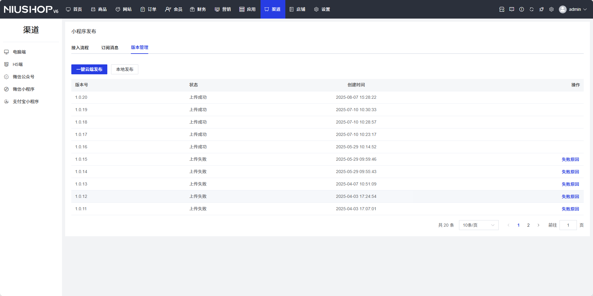 - 对于上传失败的版本,点击操作列中的「失败原因」按钮,查看失败原因