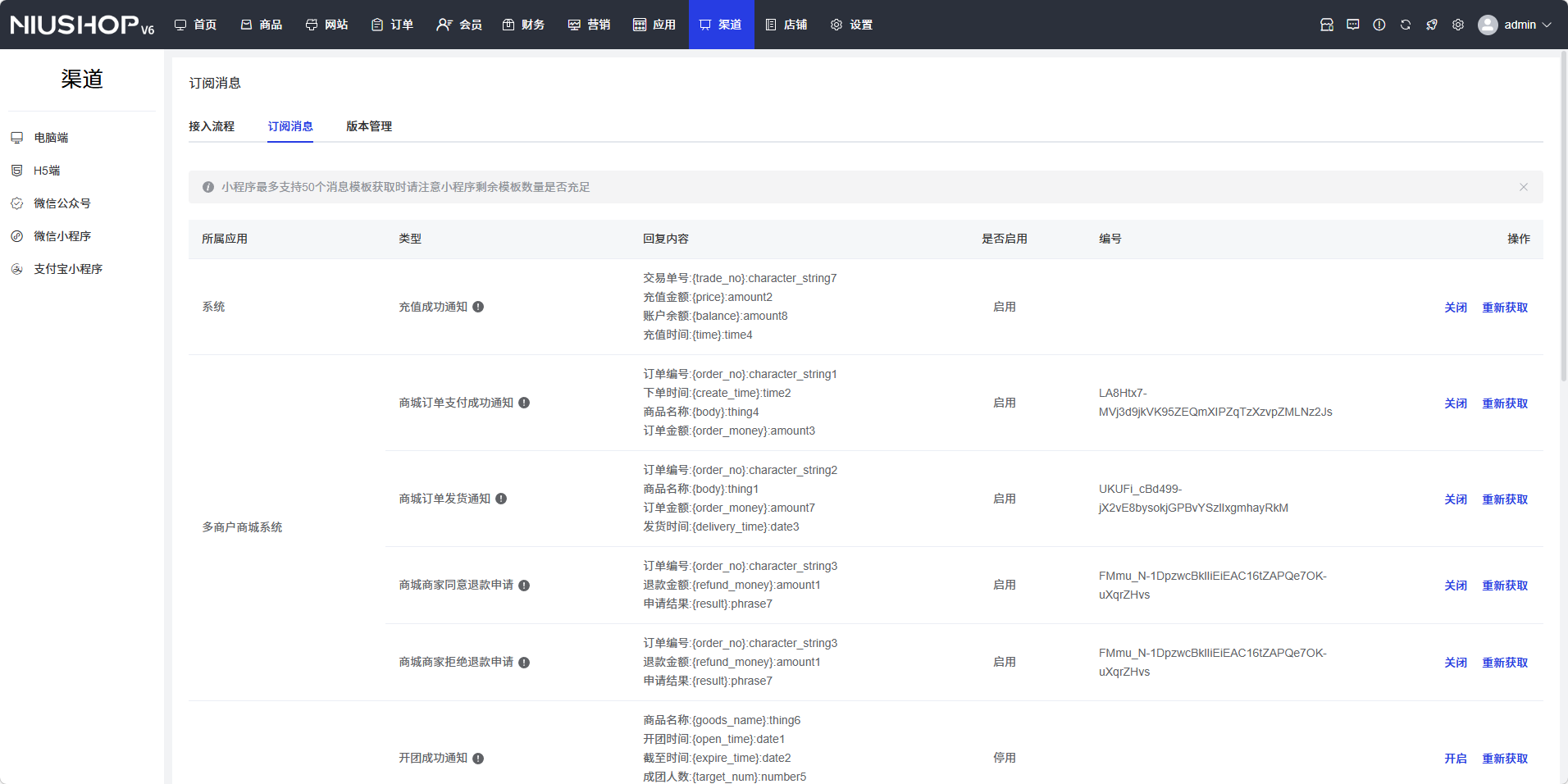 - 找到需要管理的订阅消息,点击操作列中的「开启」或「关闭」按钮,开启或关闭该订阅消息