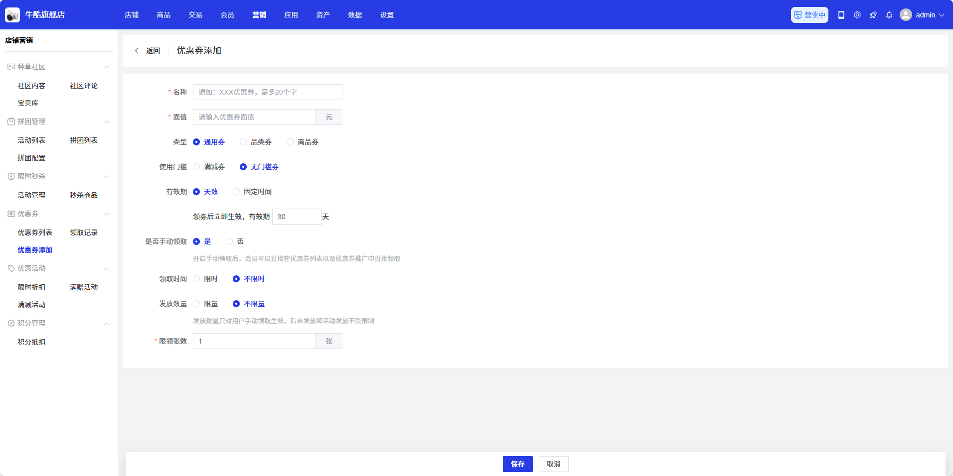 - 优惠券面值:输入优惠券的面值金额