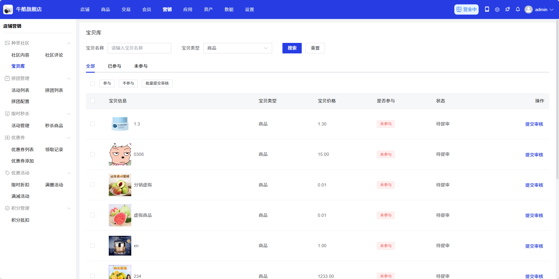 在宝贝库列表中,找到需要提交审核的宝贝,点击操作列中的「提交审核」按钮,提交审核。