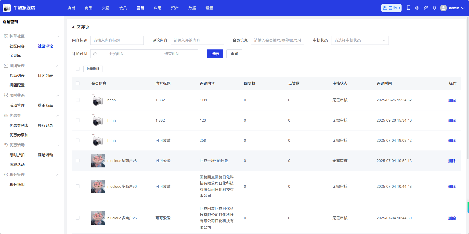 社区评论页面用于管理种草社区内容的评论,商家可以在此查看、删除评论,还可以搜索和筛选评论。通过社区评论管理,商家可以维护社区环境,促进用户良性互动。