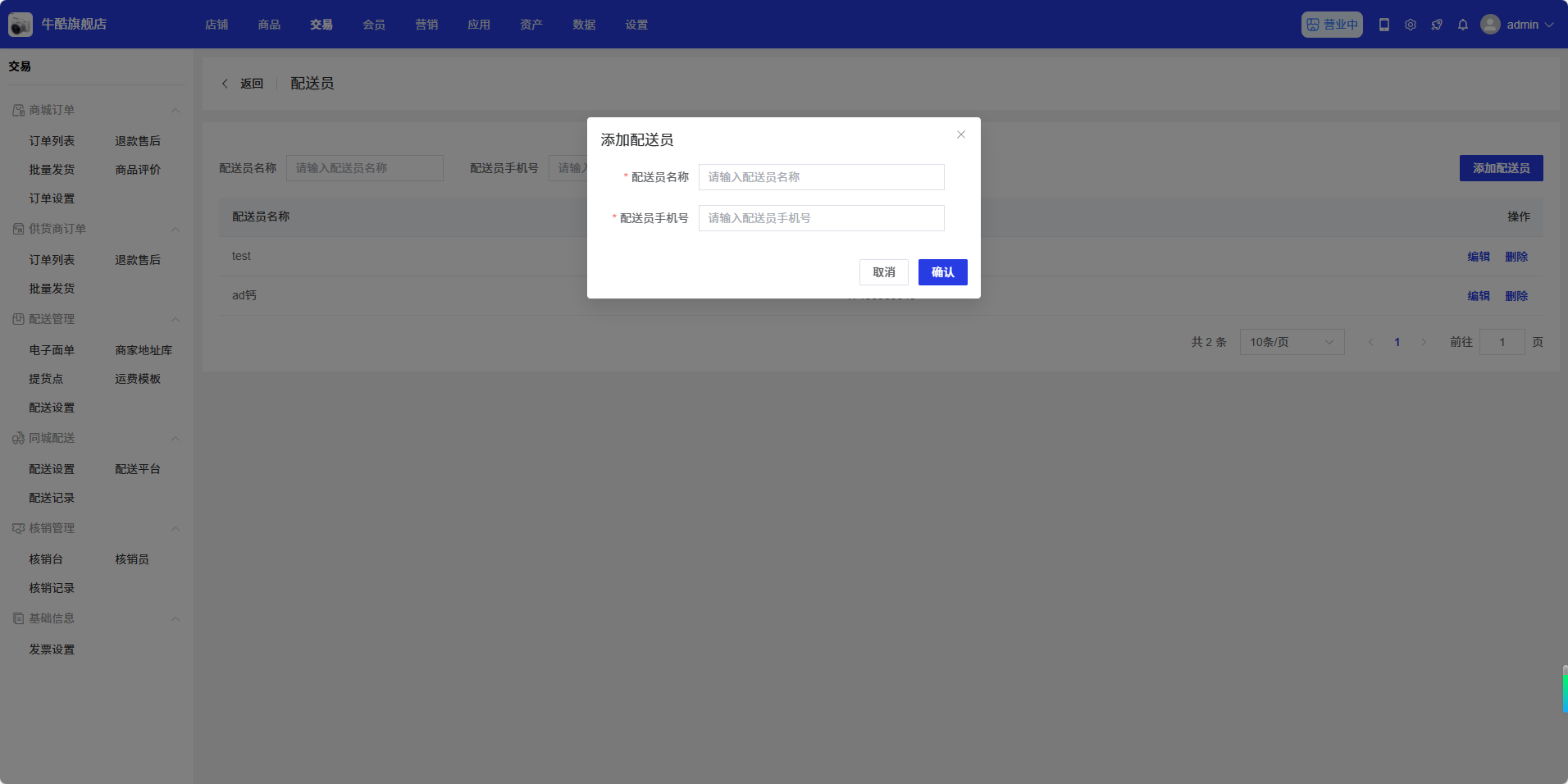 - 填写配送员名称和手机号,点击「确认」按钮添加