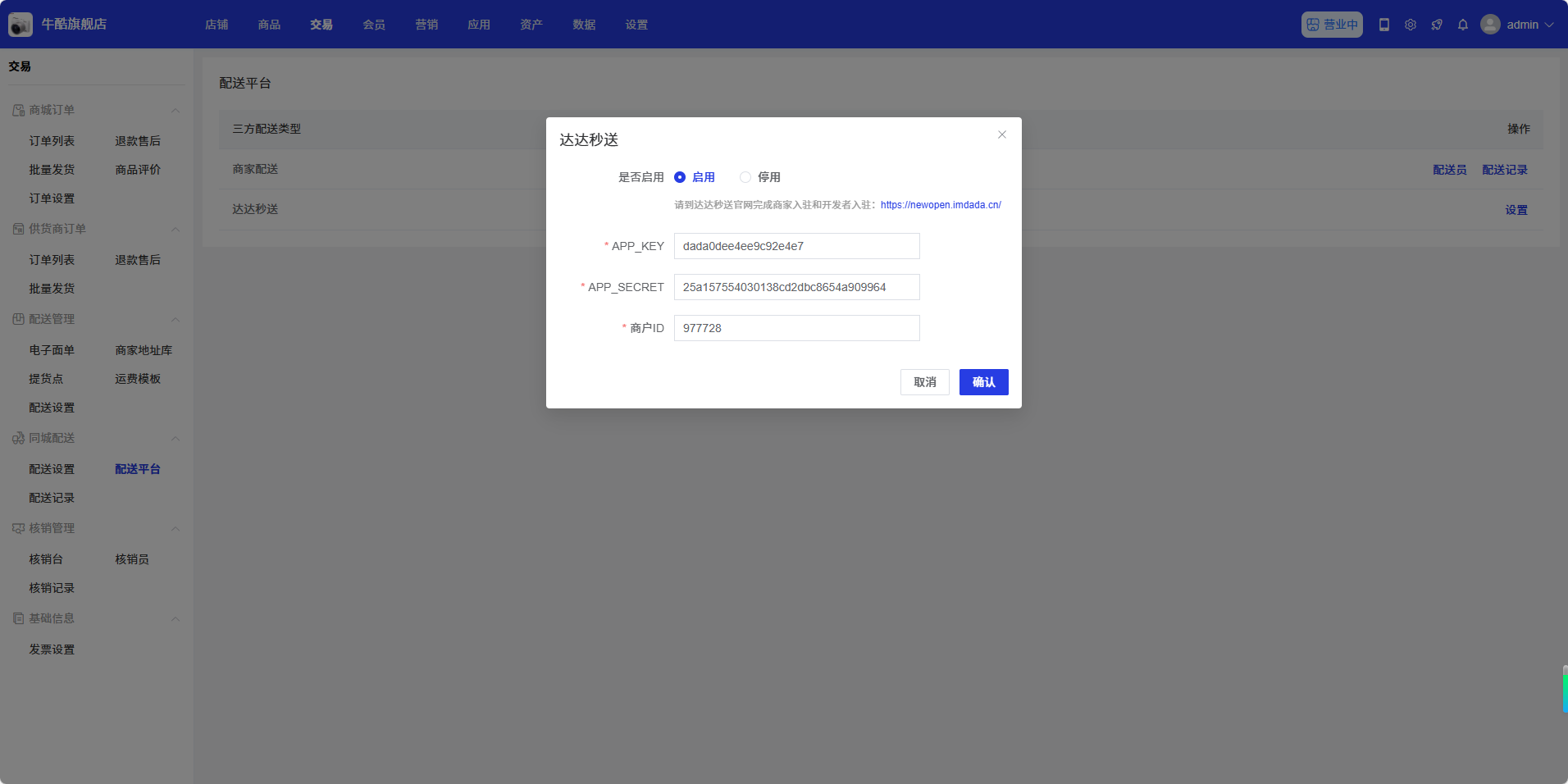 - 点击「配置」按钮,弹出达达配送配置对话框: