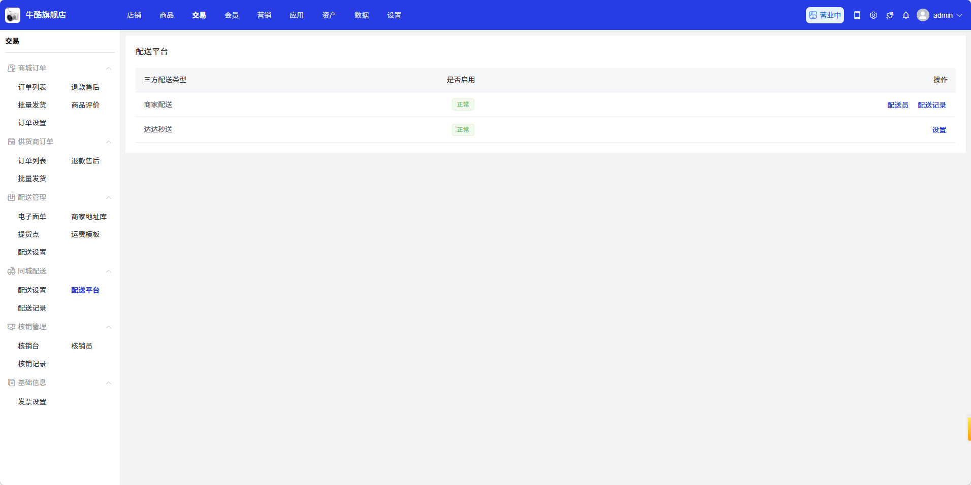 配送平台页面用于管理第三方配送服务,供货商可以在此开通或关闭不同的配送平台,如商联配送、达达配送等。通过配送平台管理,供货商可以选择适合自己业务的配送服务,提高配送效率。