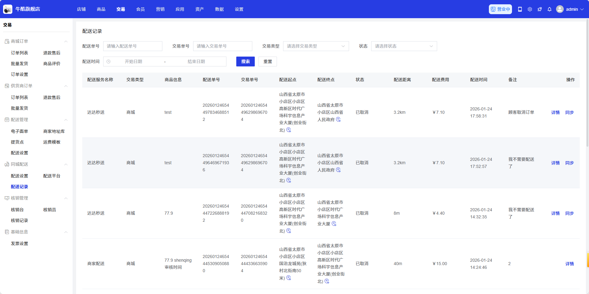配送记录页面用于商家查看配送记录,商家可以在此查看所有订单的配送记录,包括配送状态、配送时间、配送员信息等。