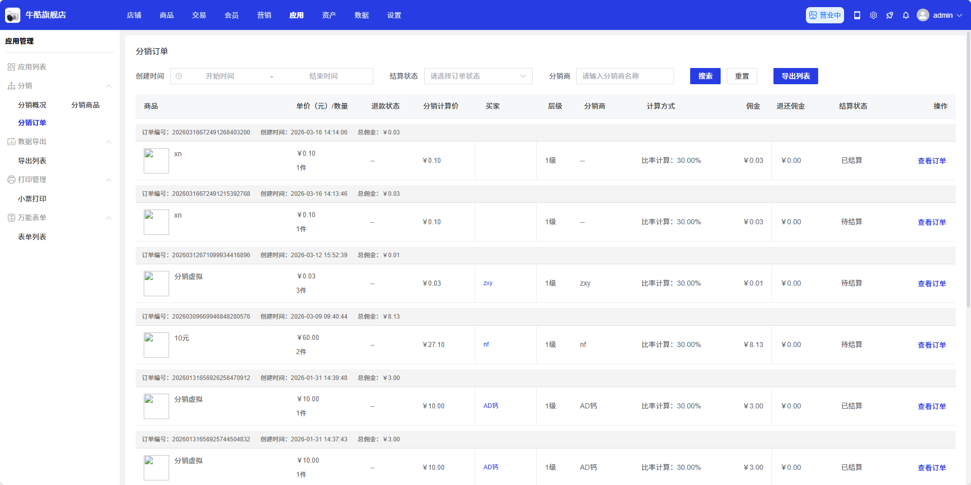 分销订单页面用于管理分销产生的订单,商家可以在此查看分销订单的详细信息,包括订单金额、佣金、分销商信息等。通过分销订单管理,商家可以了解分销业务的订单情况,便于佣金结算。