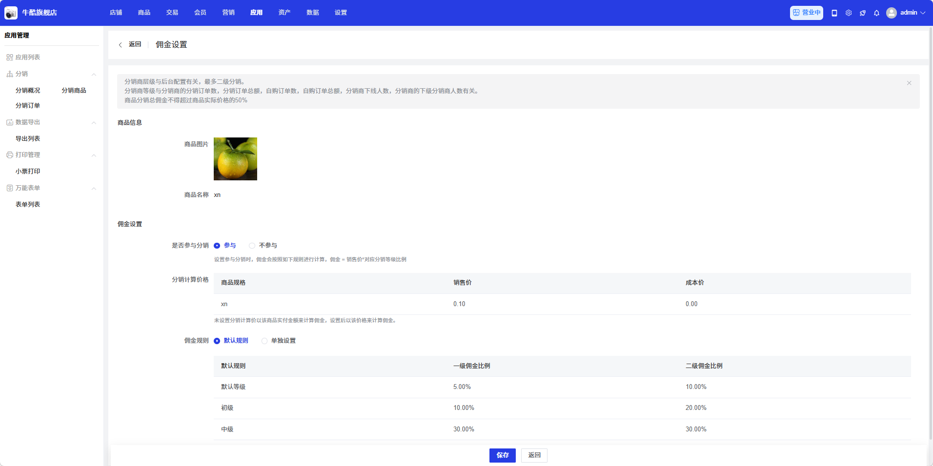 配置完成后点击「保存」生效,点击「返回」回到分销商品列表页。