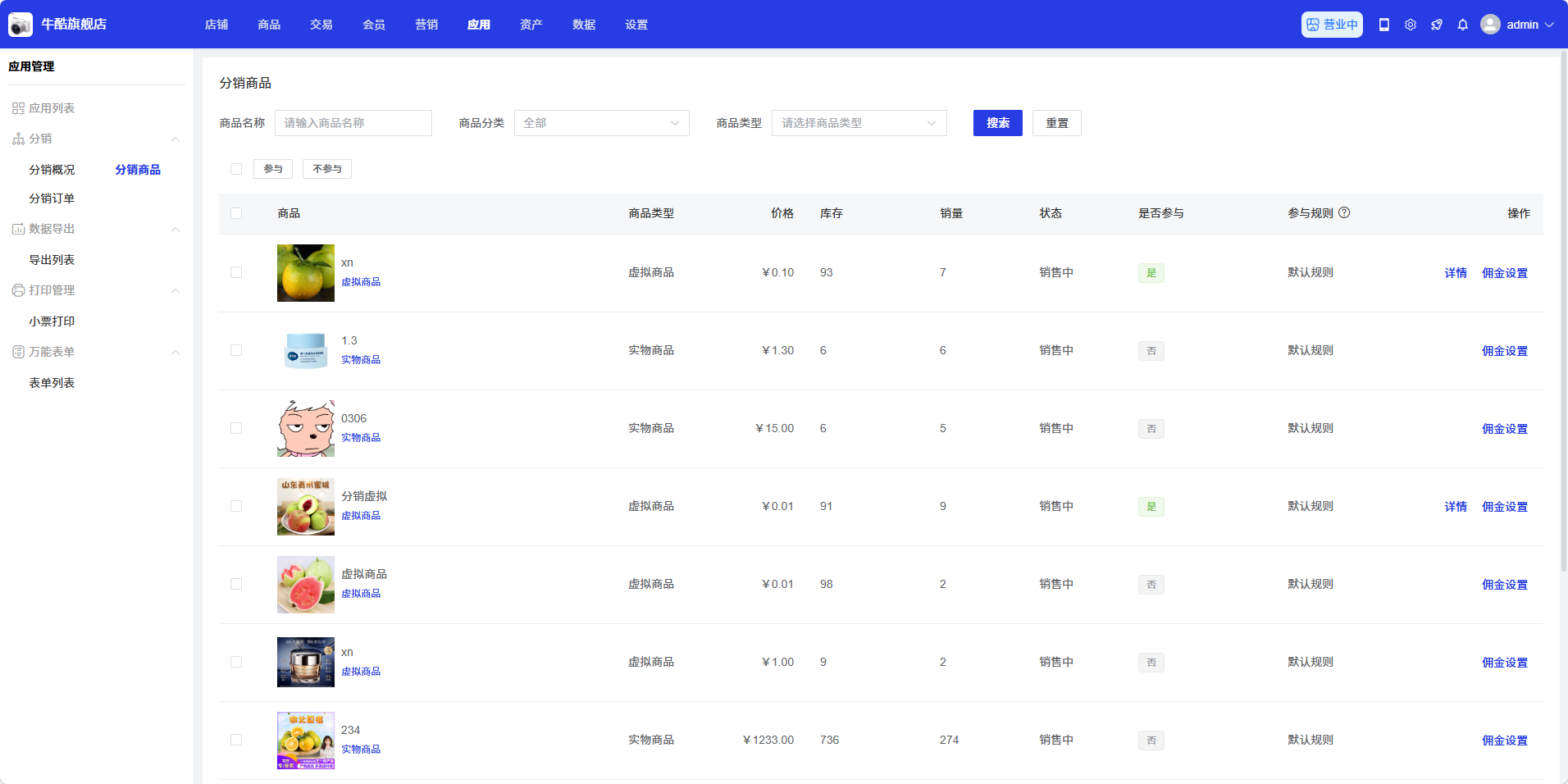 - 批量参与/不参与分销:选择多个商品后,点击「是否参与」按钮,批量参与/不参与选中的分销商品