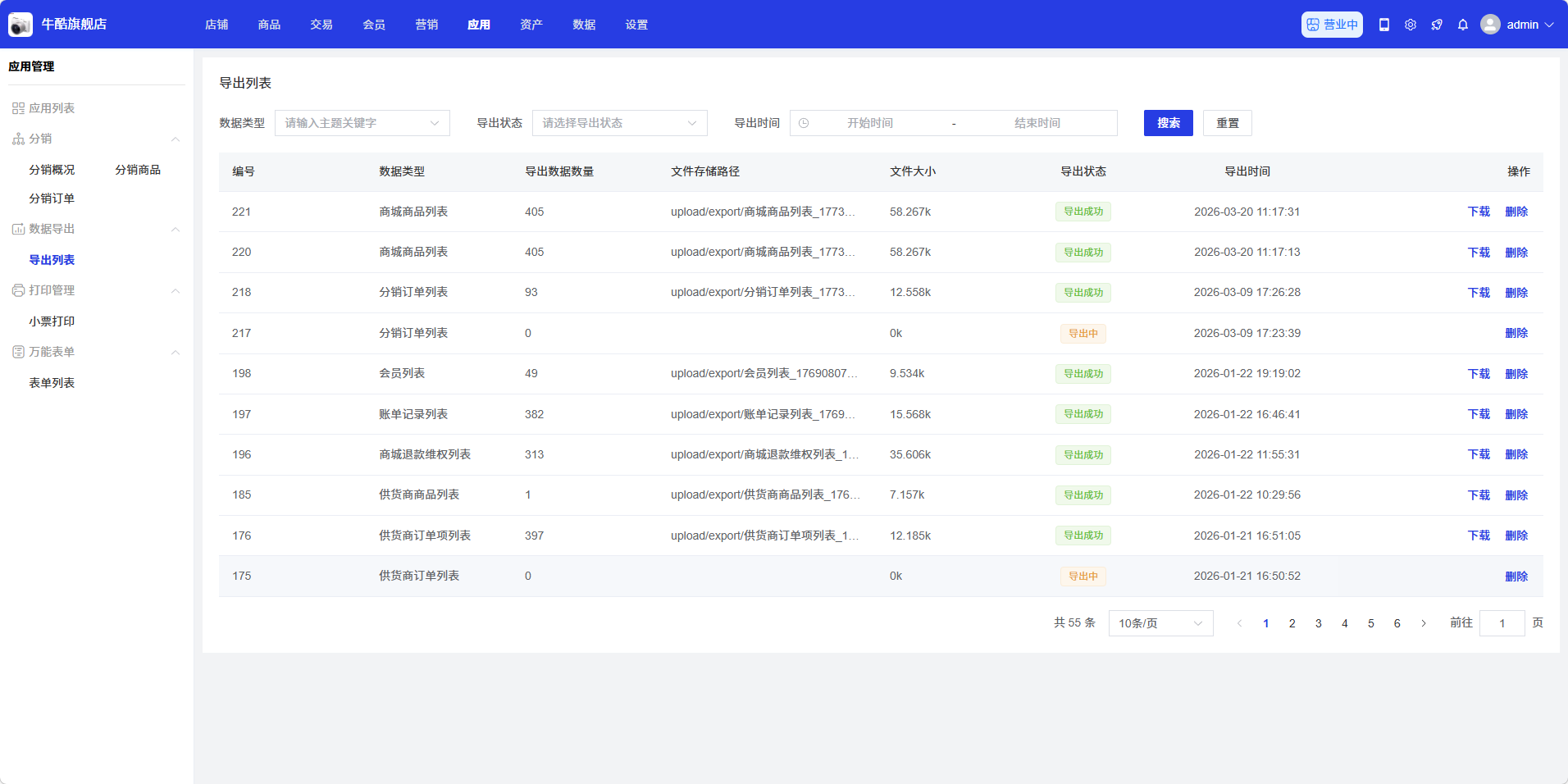 导出列表页面用于管理系统导出的数据记录,商家可以在此查看导出的数据类型、导出状态、文件大小等信息,还可以下载导出的文件。通过导出列表管理,商家可以方便地查看和管理导出的数据文件。