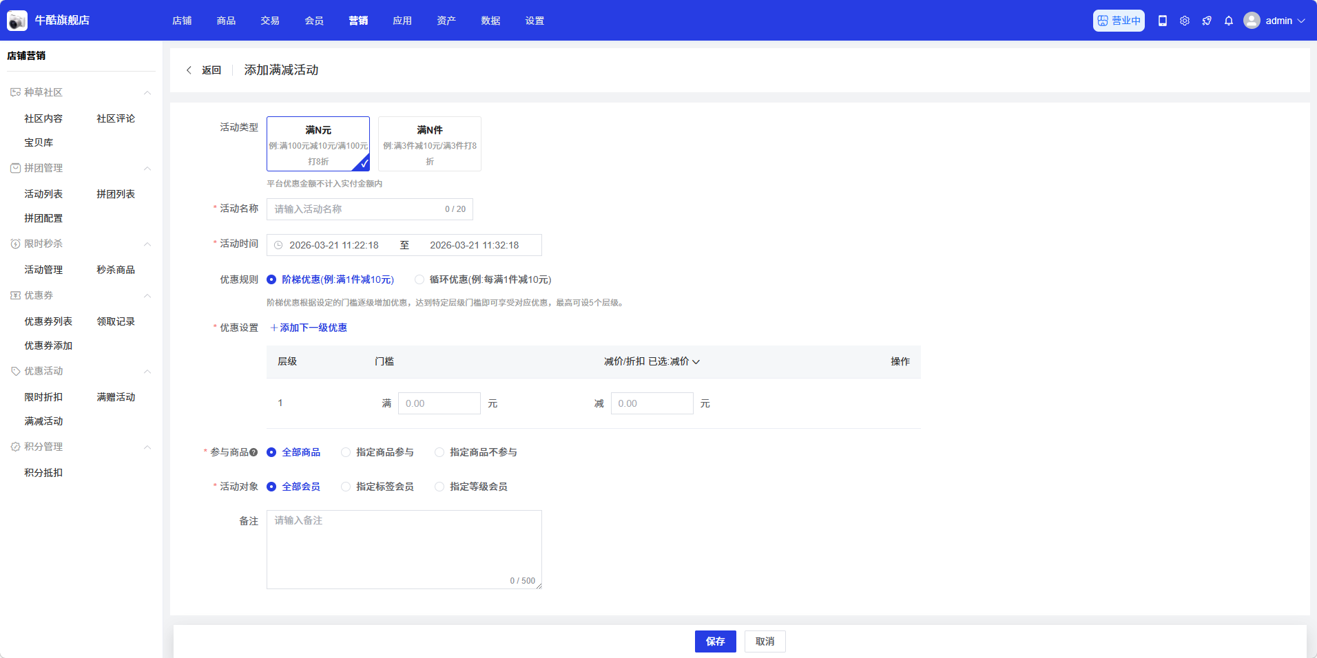 - 活动类型:选择活动类型(满减活动)