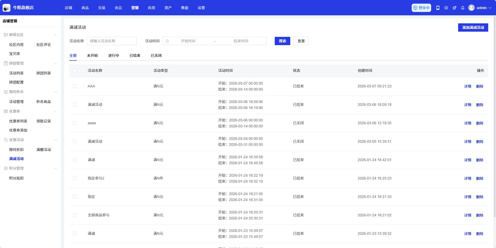满减活动页面用于管理满减促销活动,商家可以在此添加、删除、查看满减活动,通过满减活动,商家可以提高客单价,刺激用户消费。