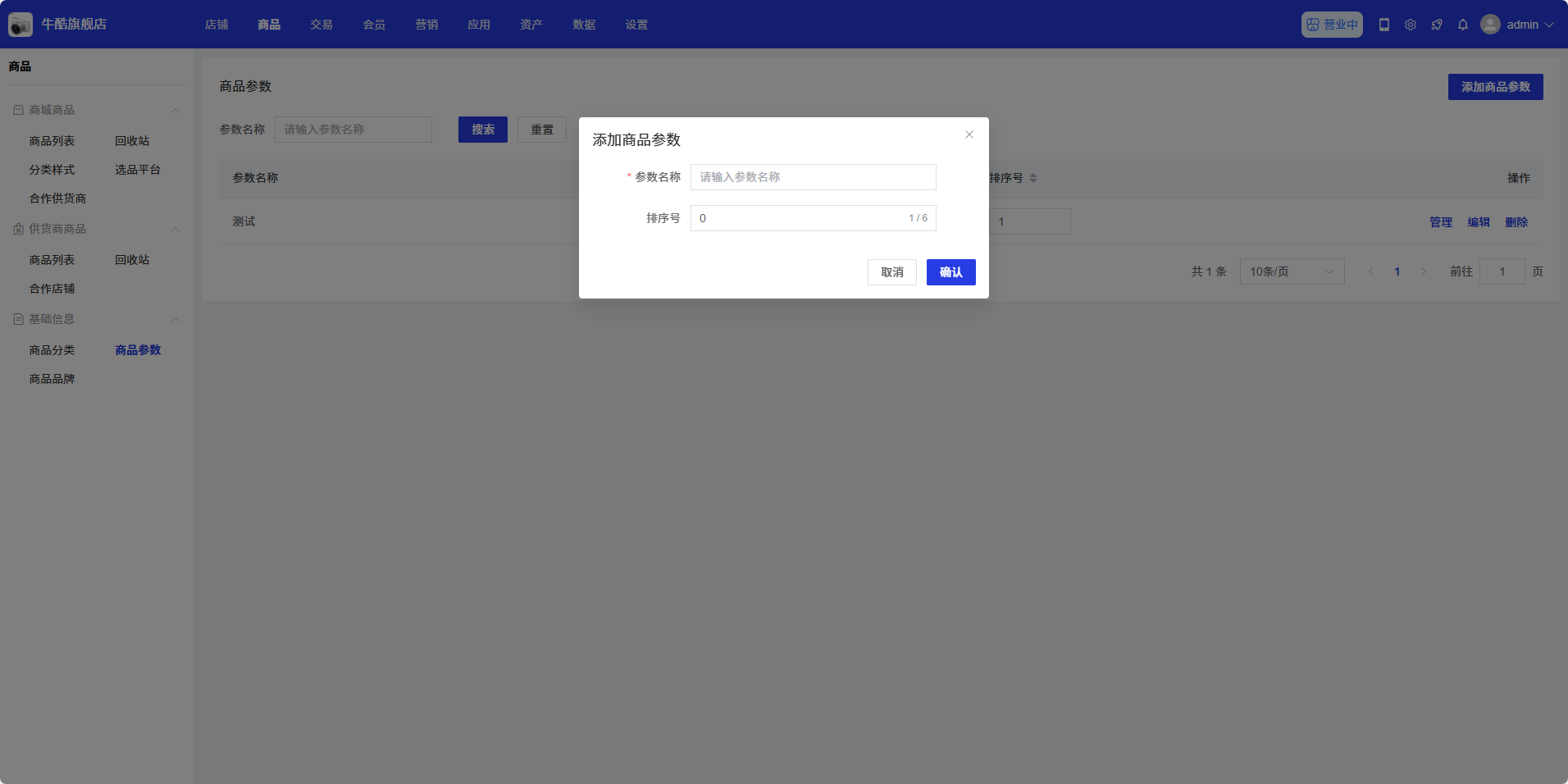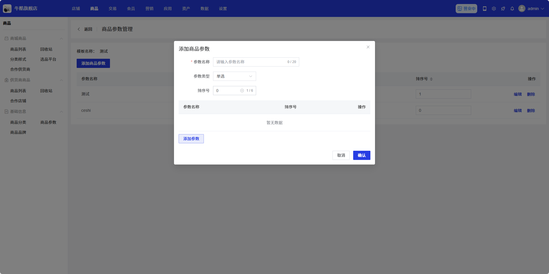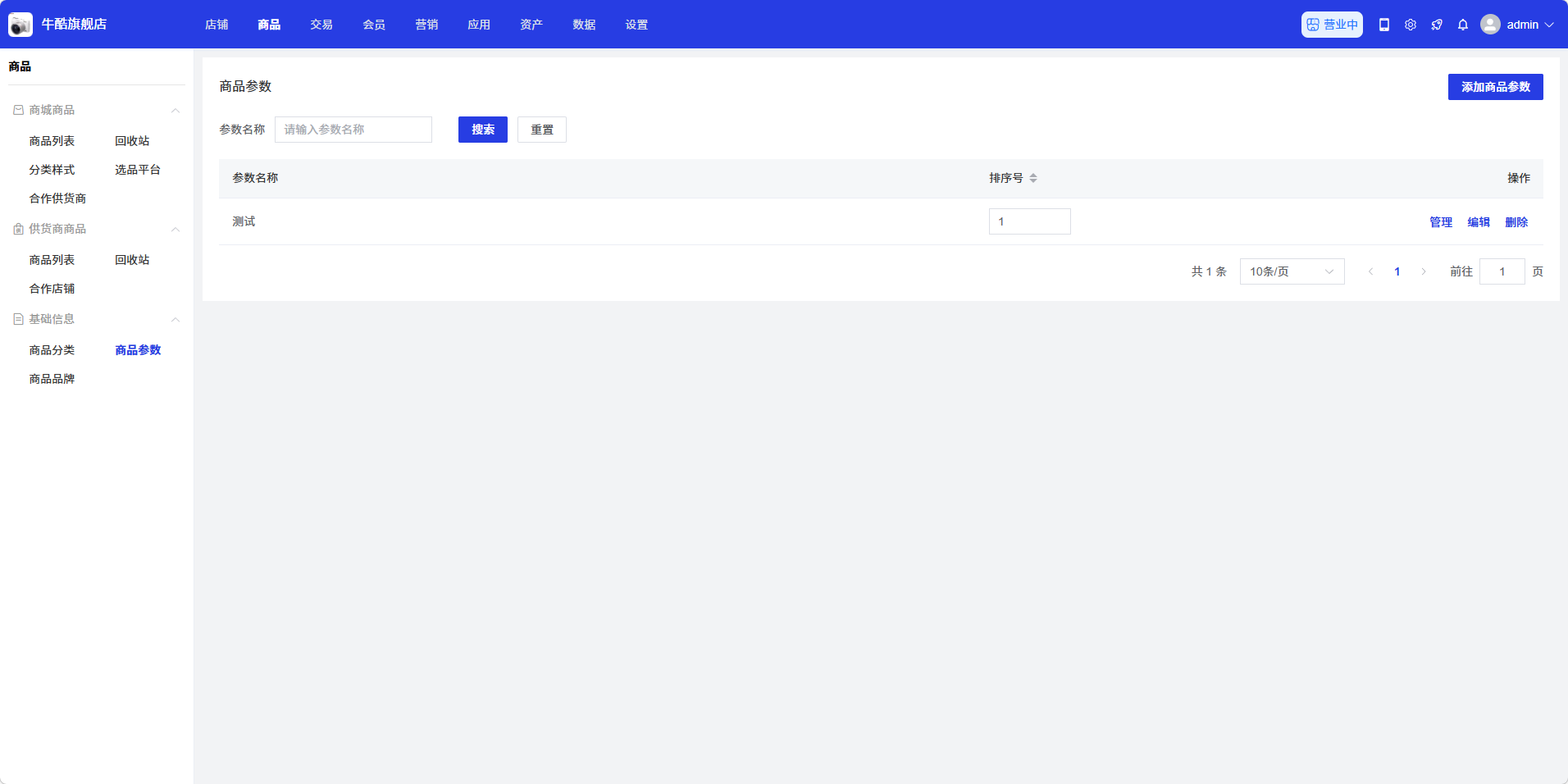 商品参数页面用于管理商品的参数信息,商家可以在此添加、编辑、删除商品参数,以及设置参数的排序。通过商品参数管理,商家可以为商品添加详细的规格和属性信息,提高商品的描述准确性和搜索效率。