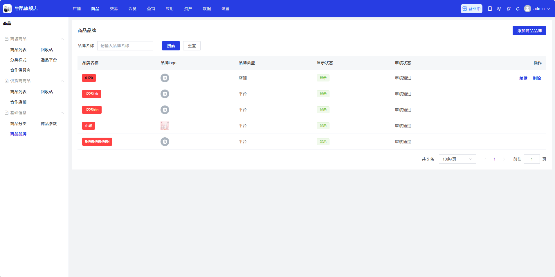 商品品牌页面用于管理商品的品牌信息,商家可以在此添加、编辑、删除商品品牌,以及设置品牌的显示状态。通过商品品牌管理,商家可以为商品添加品牌信息,提高商品的可信度和搜索效率。
