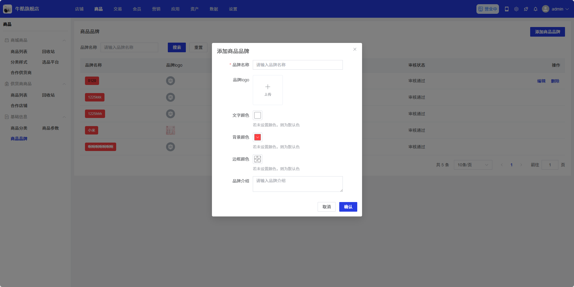 填写完成后,点击「确认」按钮保存品牌信息,点击「取消」按钮取消操作。