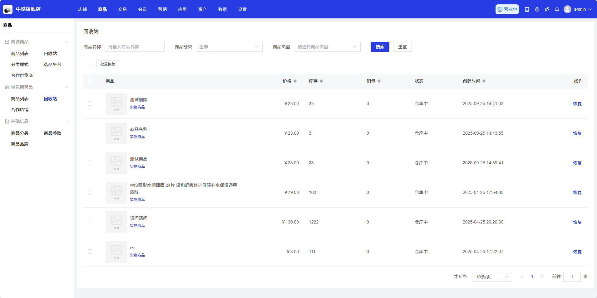 在回收站中,找到需要恢复的商品,点击操作列中的「恢复」按钮,商品将被恢复到商品列表中。