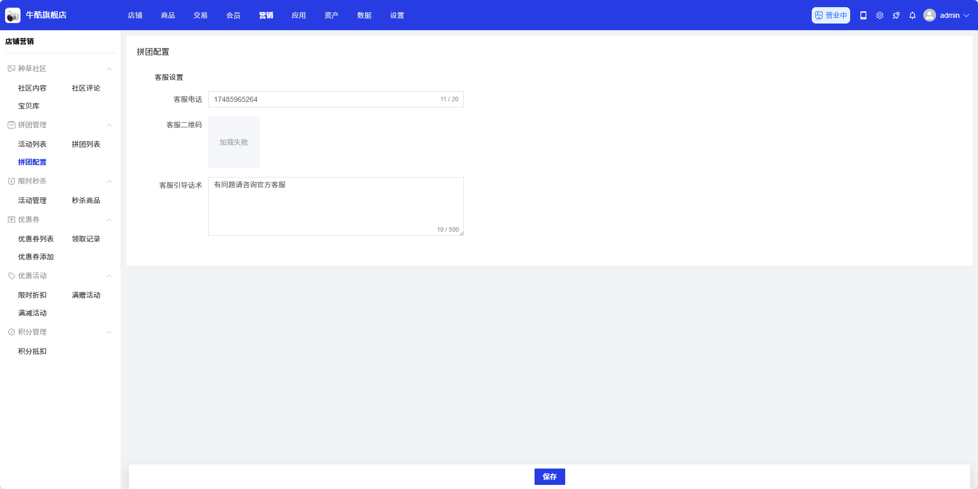 拼团配置页面用于设置拼团活动的客服相关信息,商家可以在此设置客服电话、客服二维码和客服引导话术。通过拼团配置,商家可以为用户提供更好的客服支持,提高用户体验。