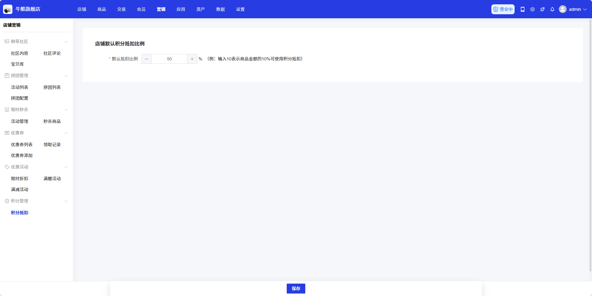 积分抵扣页面用于配置积分抵扣的相关规则,商家可以在此设置默认积分抵扣比例。通过积分抵扣设置,商家可以灵活配置积分使用规则,提高用户活跃度和忠诚度。