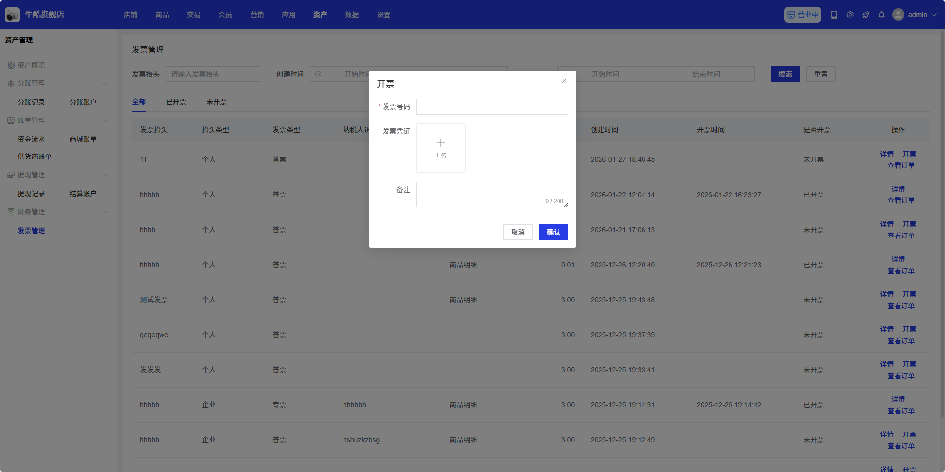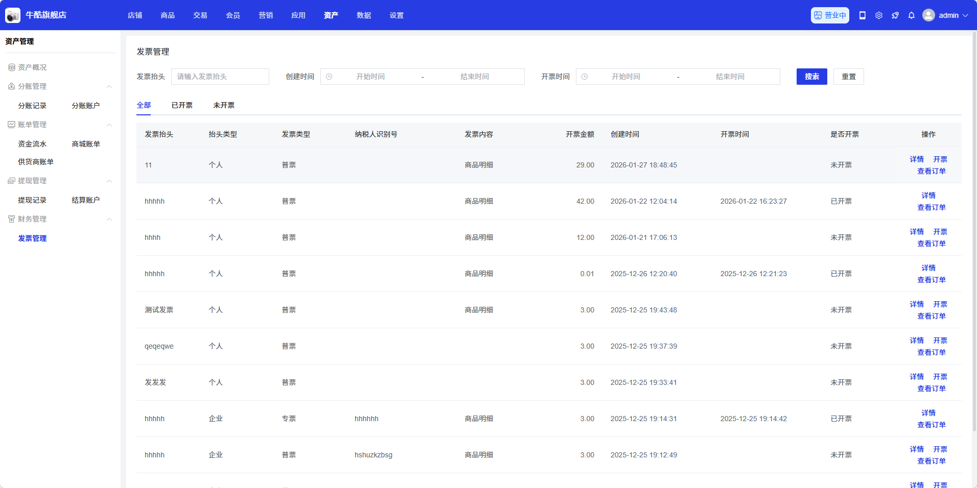 发票管理页面用于管理发票相关的记录,商家可以在此查看发票的详细信息,如发票抬头、发票类型、开票金额等,还可以进行发票的开具和管理。通过发票管理,商家可以规范发票业务流程,满足税务要求。