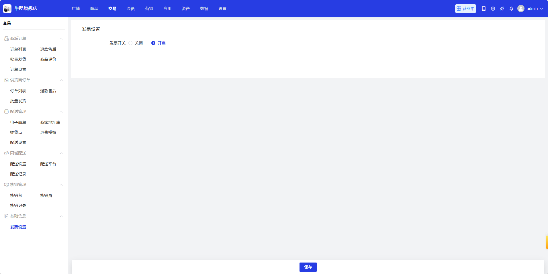 发票设置页面用于设置发票开启/关闭。