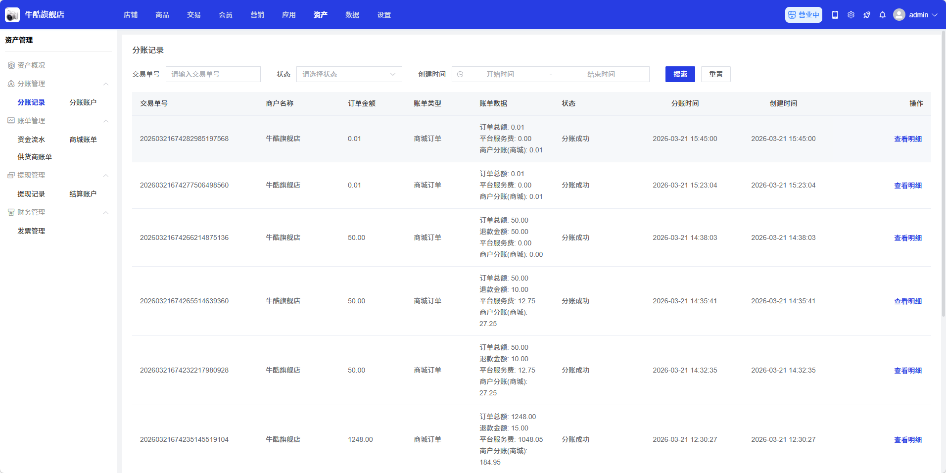 分账记录页面用于查看和管理分账相关的记录,商家可以在此查看分账的详细信息,如交易单号、商户名称、订单金额、分账状态等。通过分账记录管理,商家可以了解分账业务的运行情况,及时处理相关事宜。