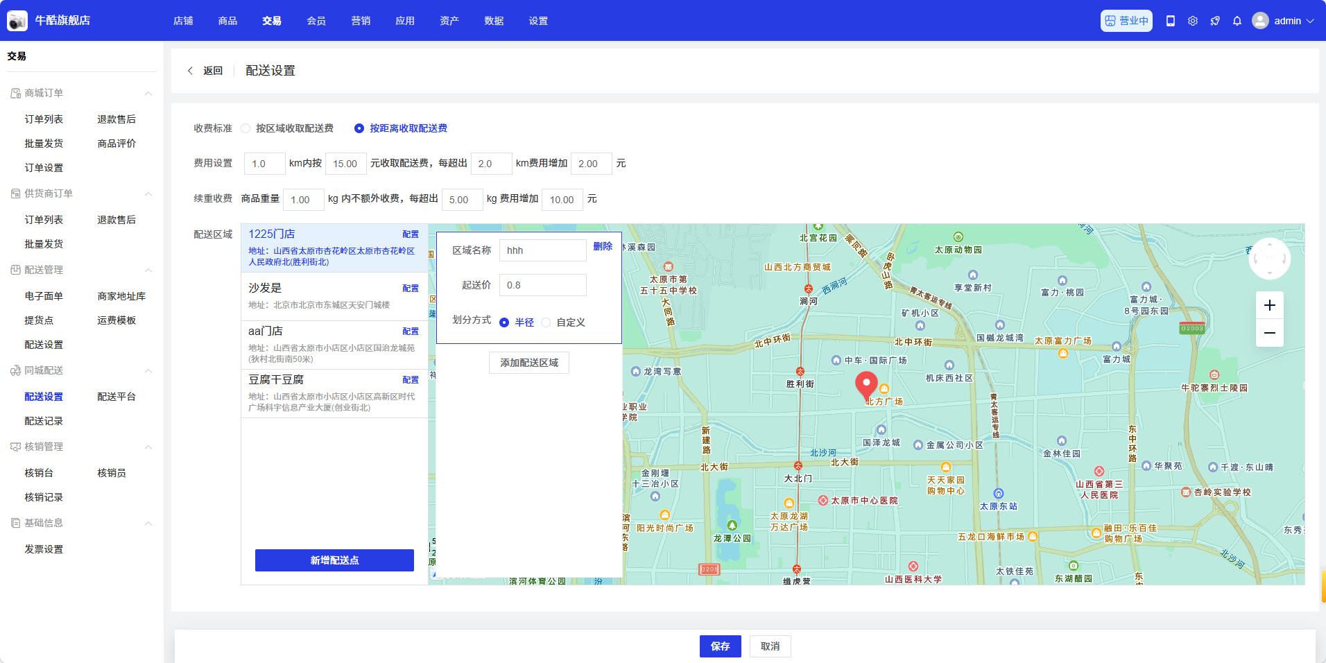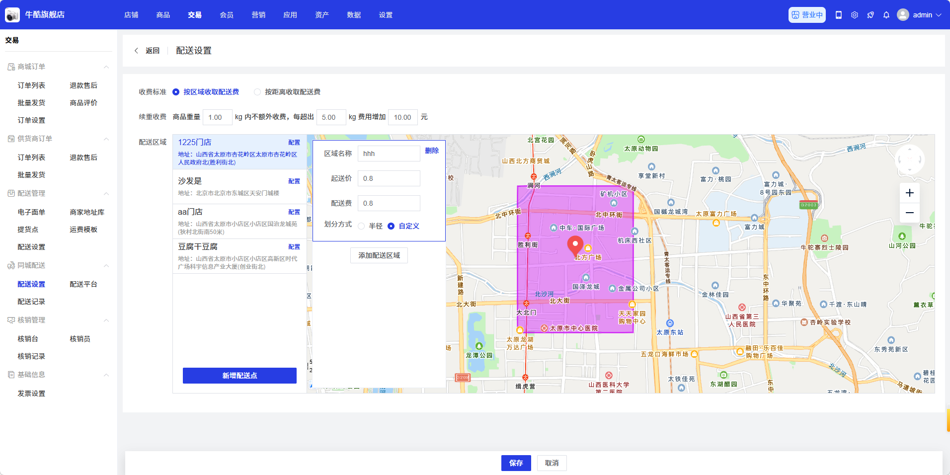 - 配送范围:在地图上设置配送区域