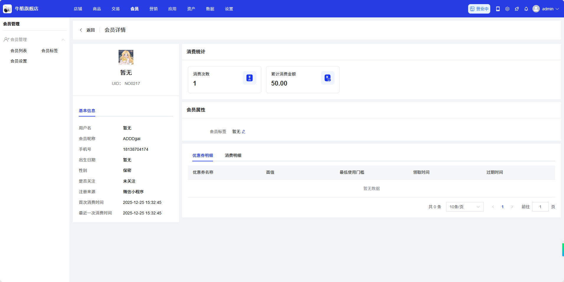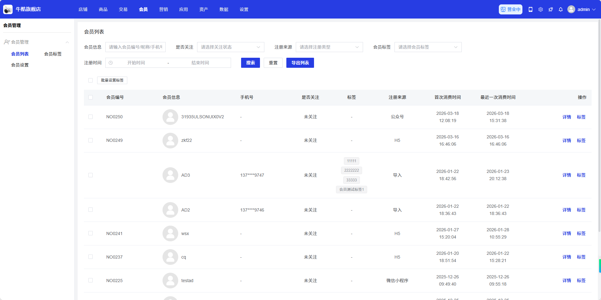 会员列表页面用于管理平台的会员信息,商家可以在此查看会员的基本信息、消费记录、标签等内容,还可以为会员添加标签。通过会员列表管理,商家可以更好地了解会员情况,进行精准营销。