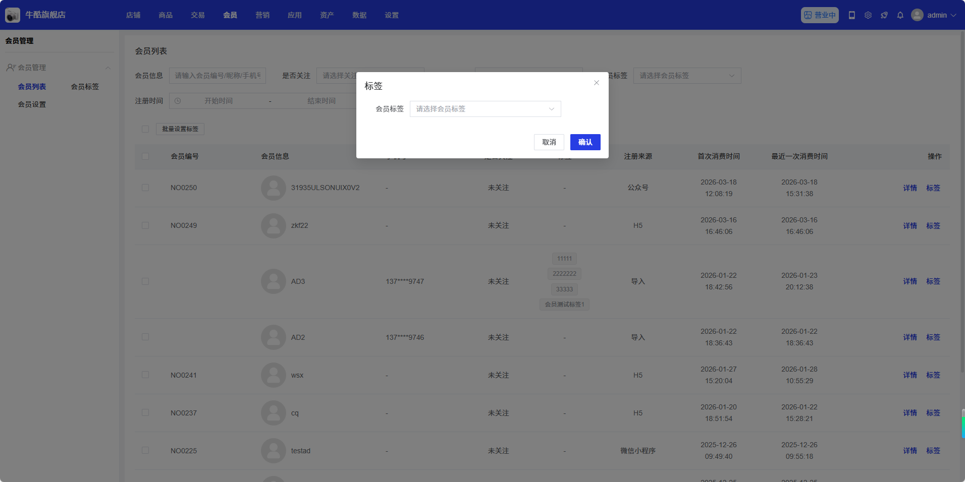 在会员列表中,找到需要添加标签的会员,点击操作列中的「标签」按钮,弹出标签对话框: