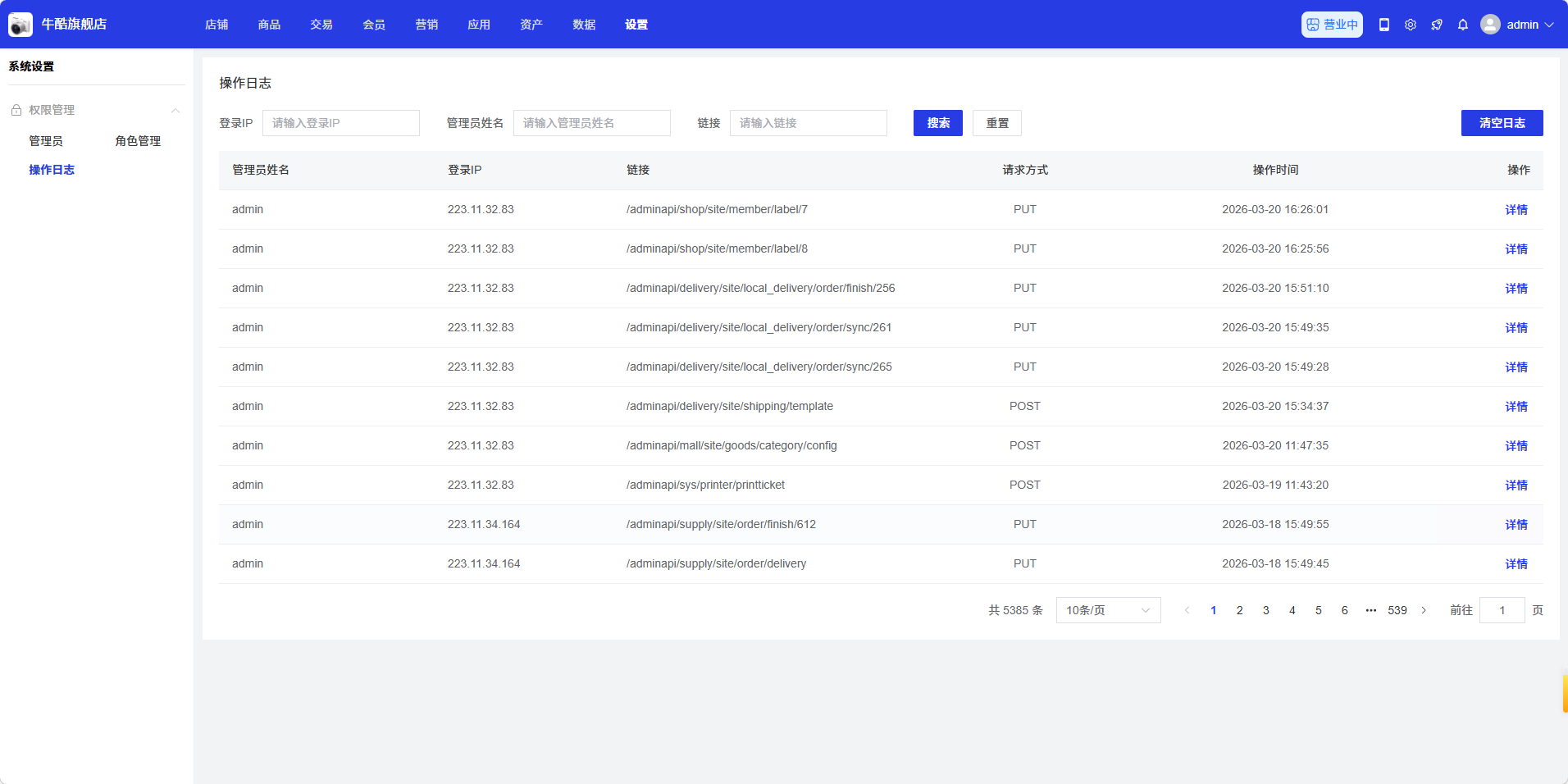 操作日志页面用于记录系统的操作记录,供货商可以在此查看管理员的操作行为,如登录、修改配置、删除数据等。通过操作日志管理,供货商可以监控系统的使用情况,追踪问题来源,保障系统安全。