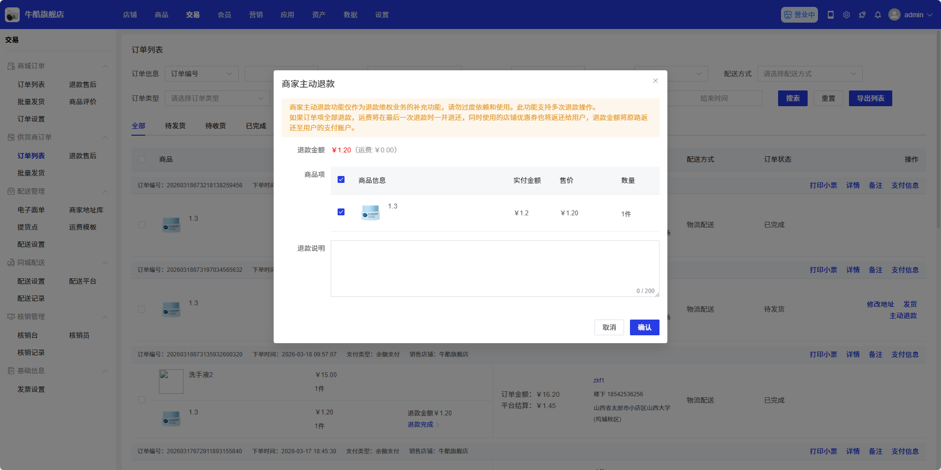 在订单列表中,找到需要退款的订单,点击操作列中的「主动退款」按钮,弹出商家主动退款对话框: