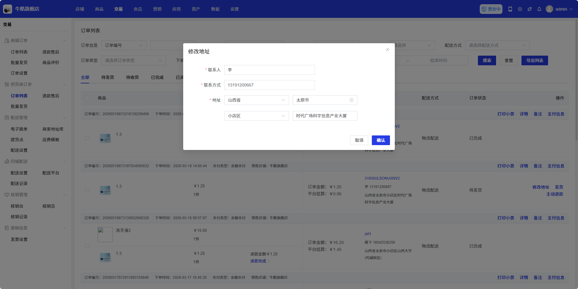 在订单列表中,找到需要修改收货地址的订单,点击操作列中的「修改地址」按钮,弹出修改地址对话框: