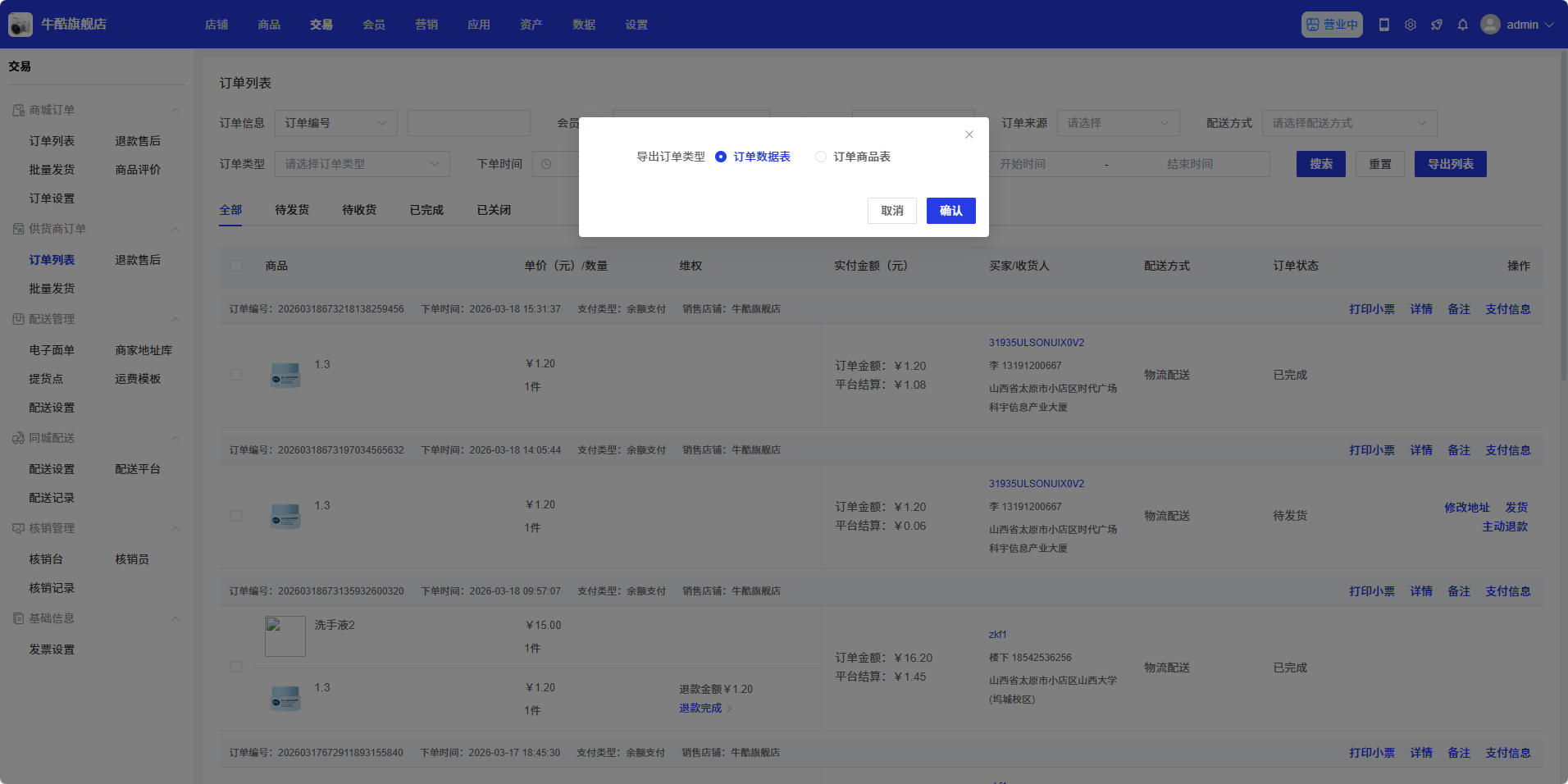 - 导出订单类型:选择导出的订单类型(订单数据表、订单商品表)