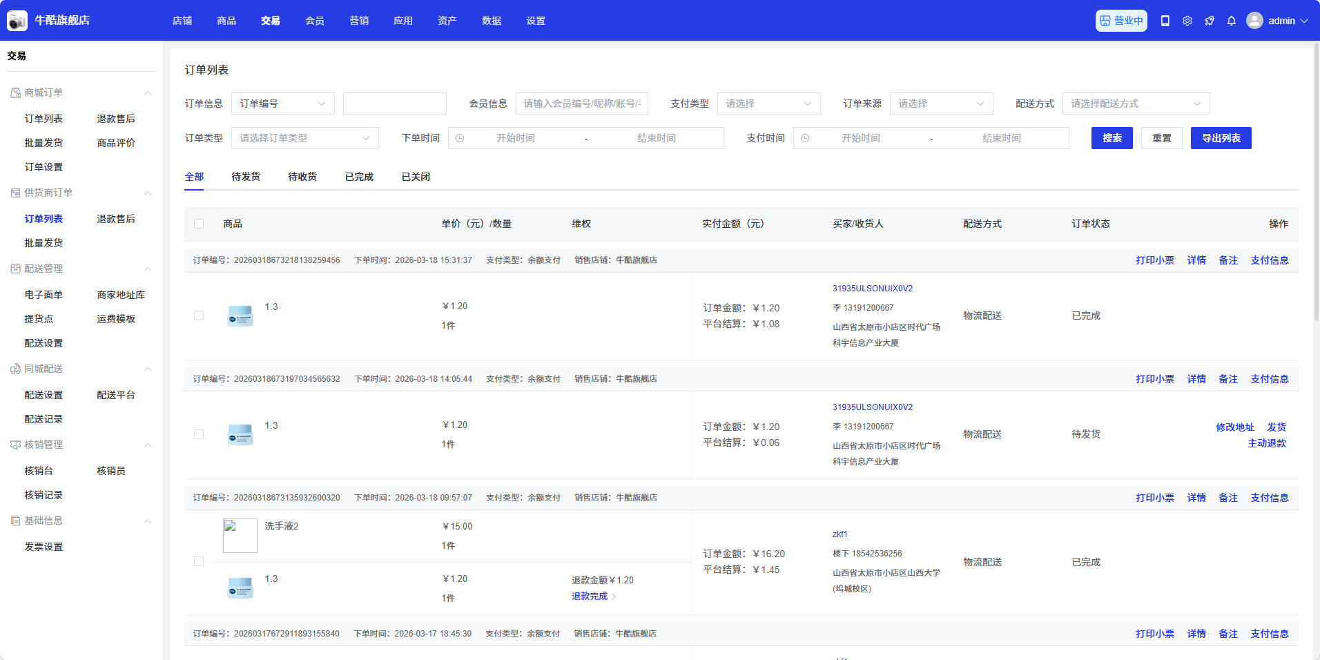 订单列表页面是供货商管理订单的核心界面,用于查看、管理和操作所有订单。通过此页面,供货商可以搜索订单、查看订单详情、修改订单信息、进行订单发货、主动退款等操作。