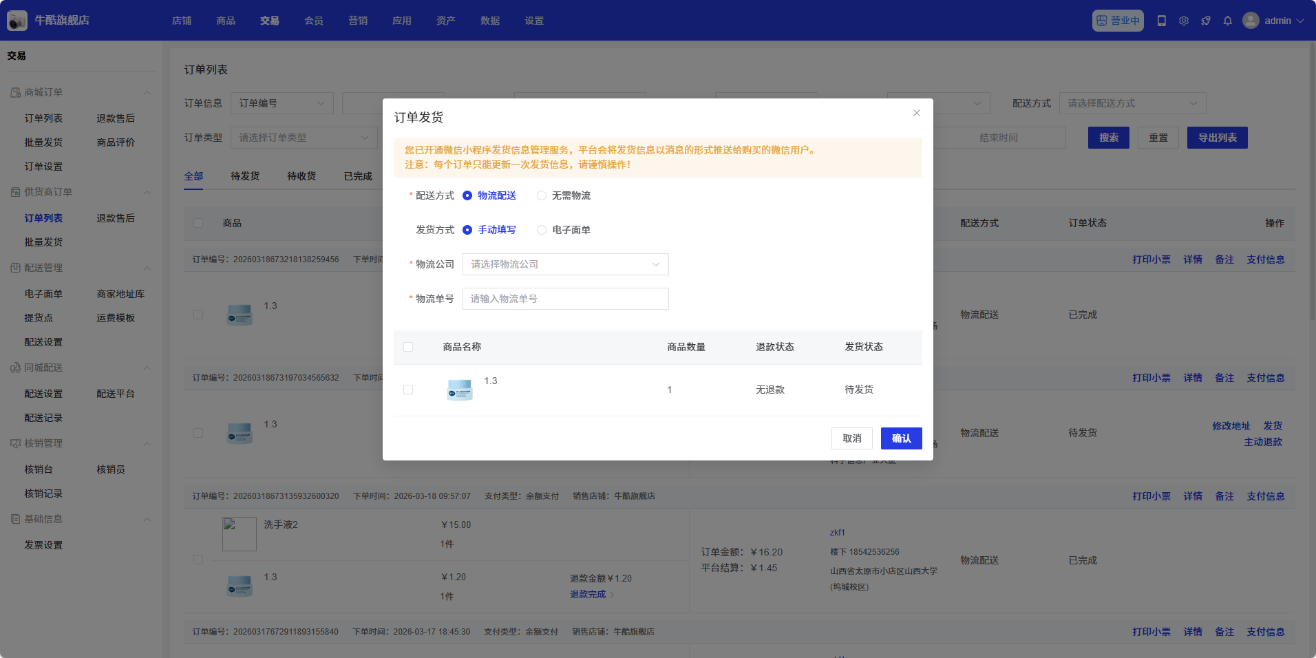 在订单列表中,找到需要发货的订单,点击操作列中的「发货」按钮,弹出订单发货对话框: