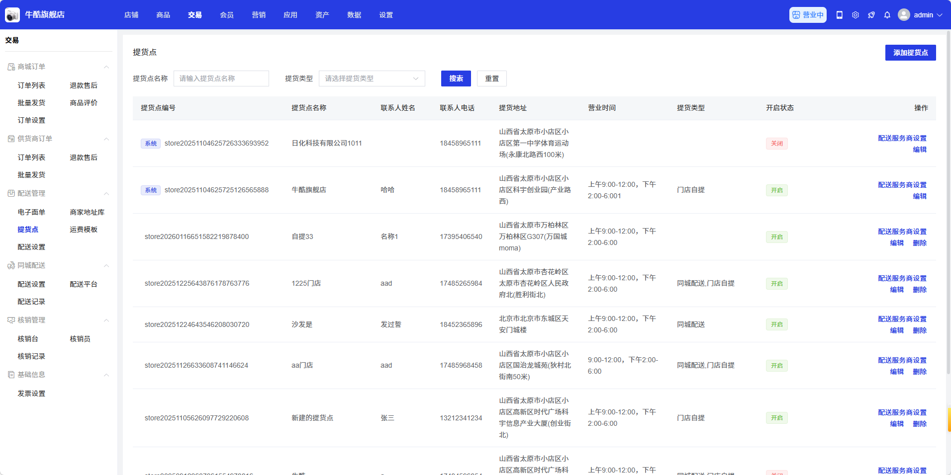- 开启状态:开启或关闭提货点