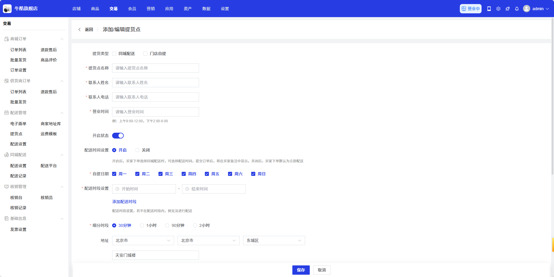 填写完成后,点击「保存」按钮保存提货点,点击「取消」按钮取消操作。