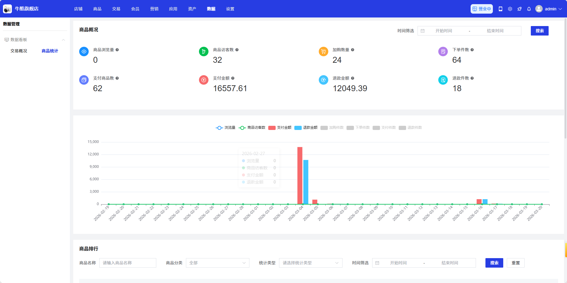 商品统计页面用于全面分析店铺商品的浏览、加购、下单、支付及售后全链路数据,帮助商家识别爆款商品、定位滞销商品、评估商品运营效果,为选品、定价及营销活动提供数据支撑。