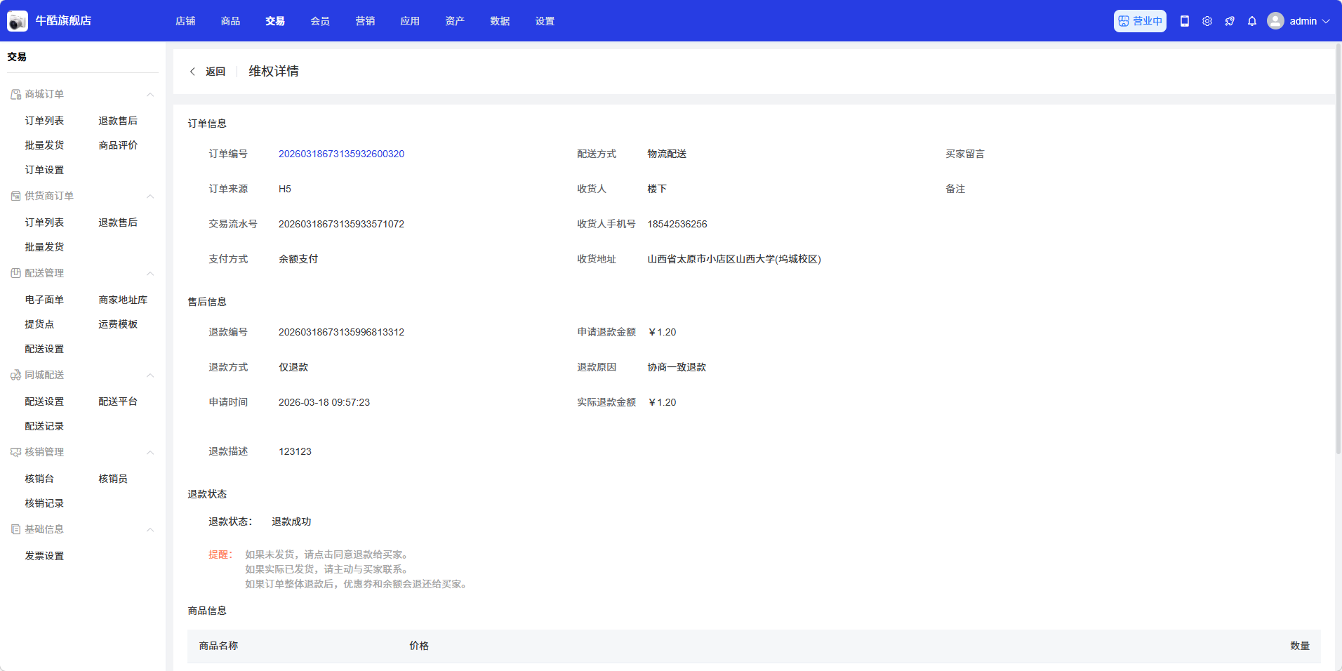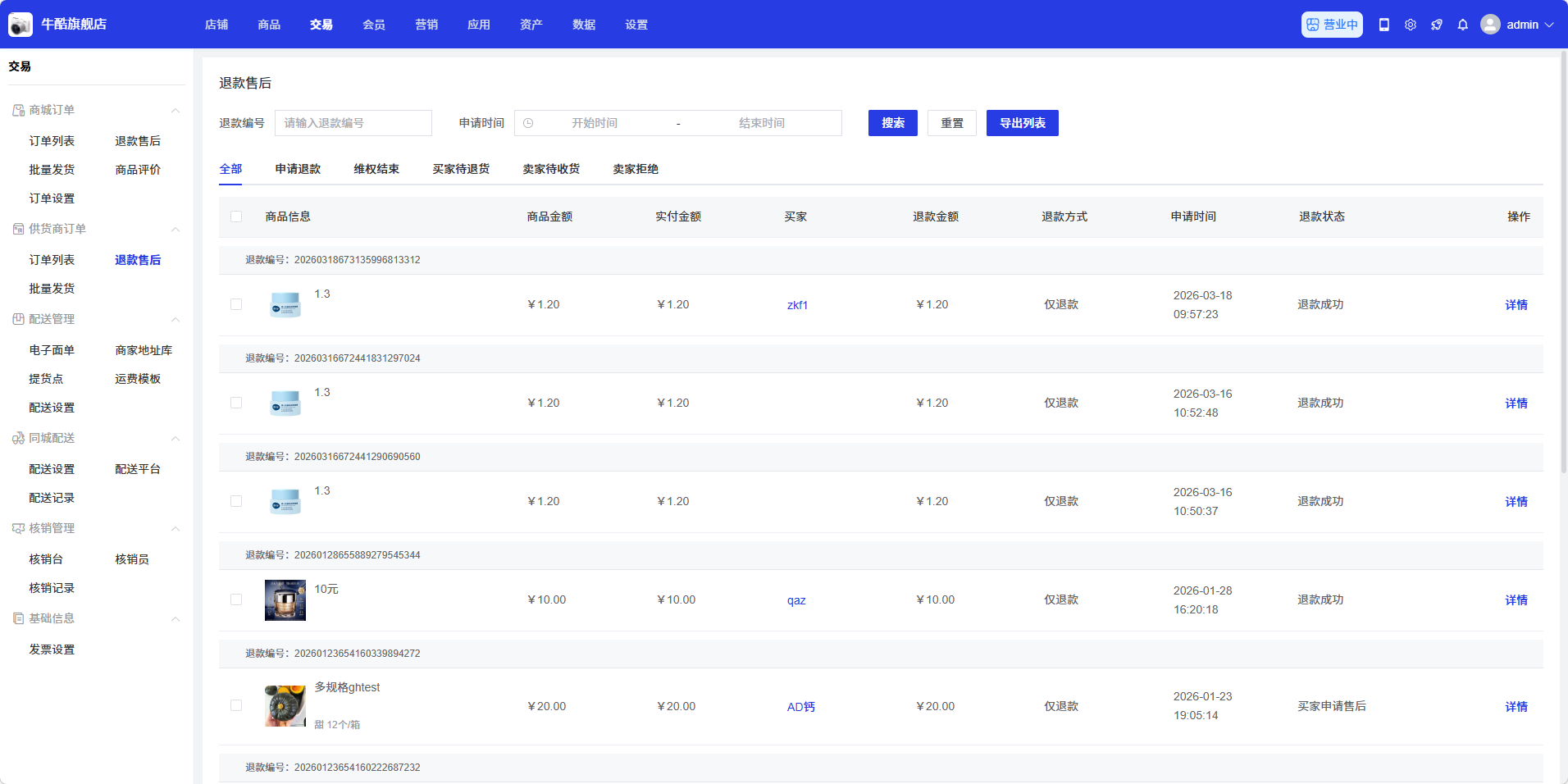 在退款售后列表中,找到需要查看的退款记录,点击操作列中的「详情」按钮,查看退款的详细信息: