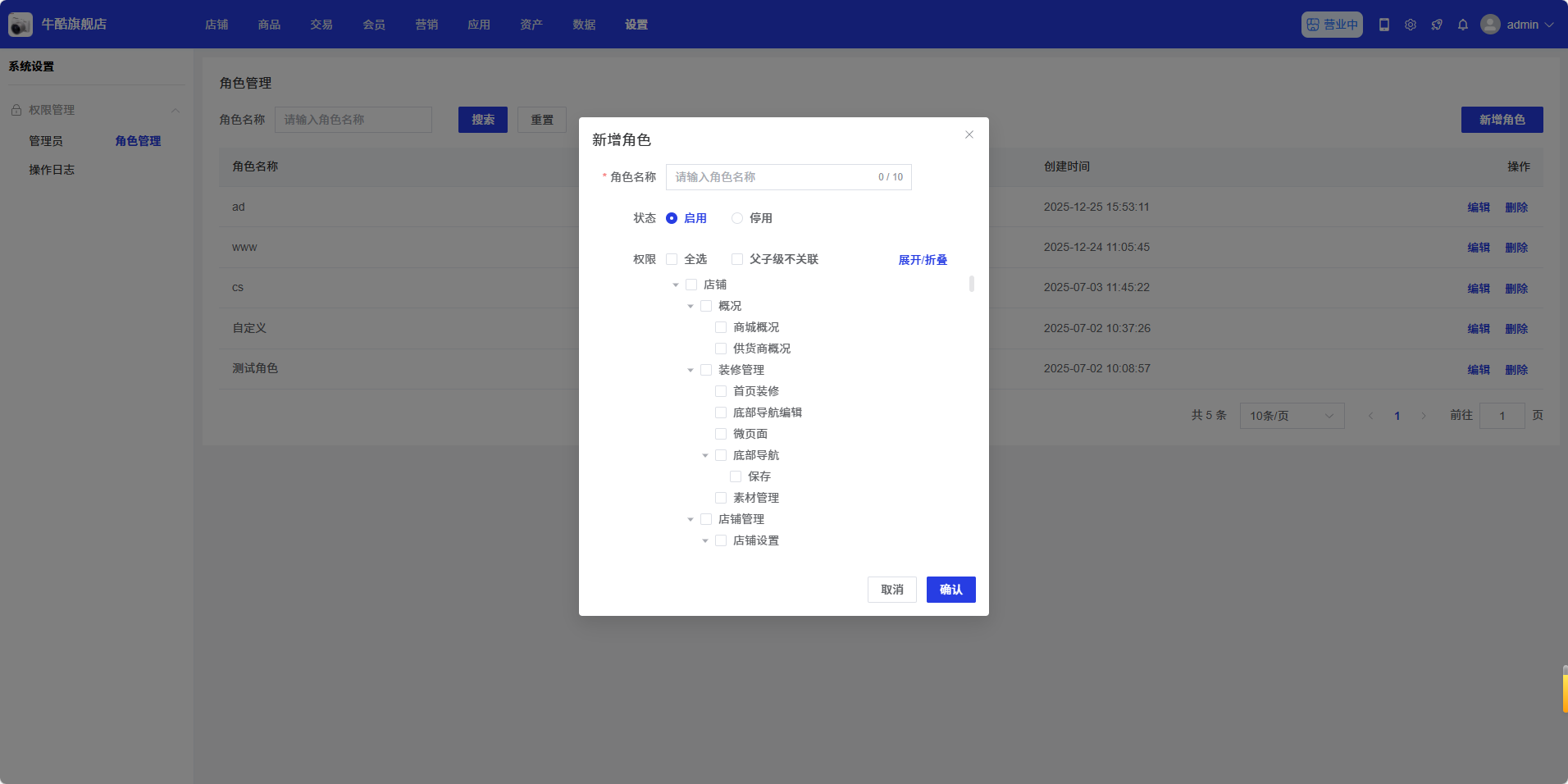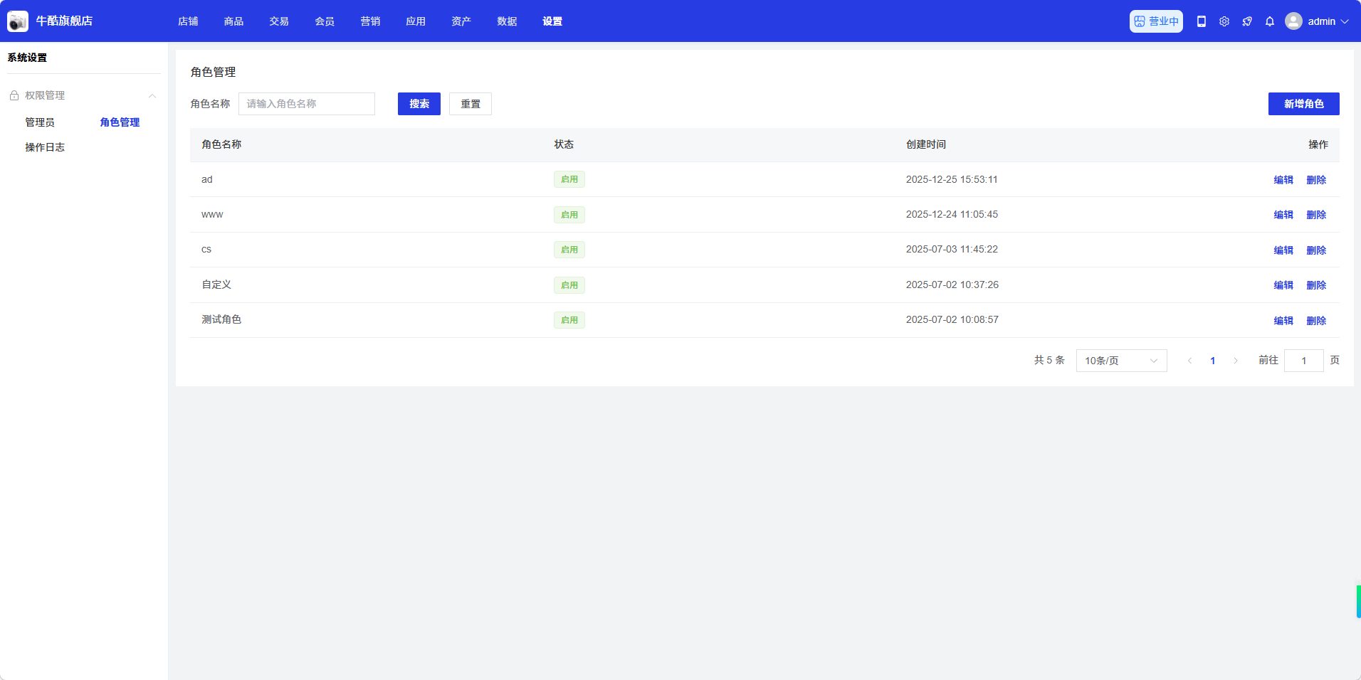 角色管理页面用于管理系统角色,供货商可以在此添加、编辑、删除角色,还可以为角色分配权限。通过角色管理,供货商可以灵活控制不同管理员的访问权限,实现权限的精细化管理。